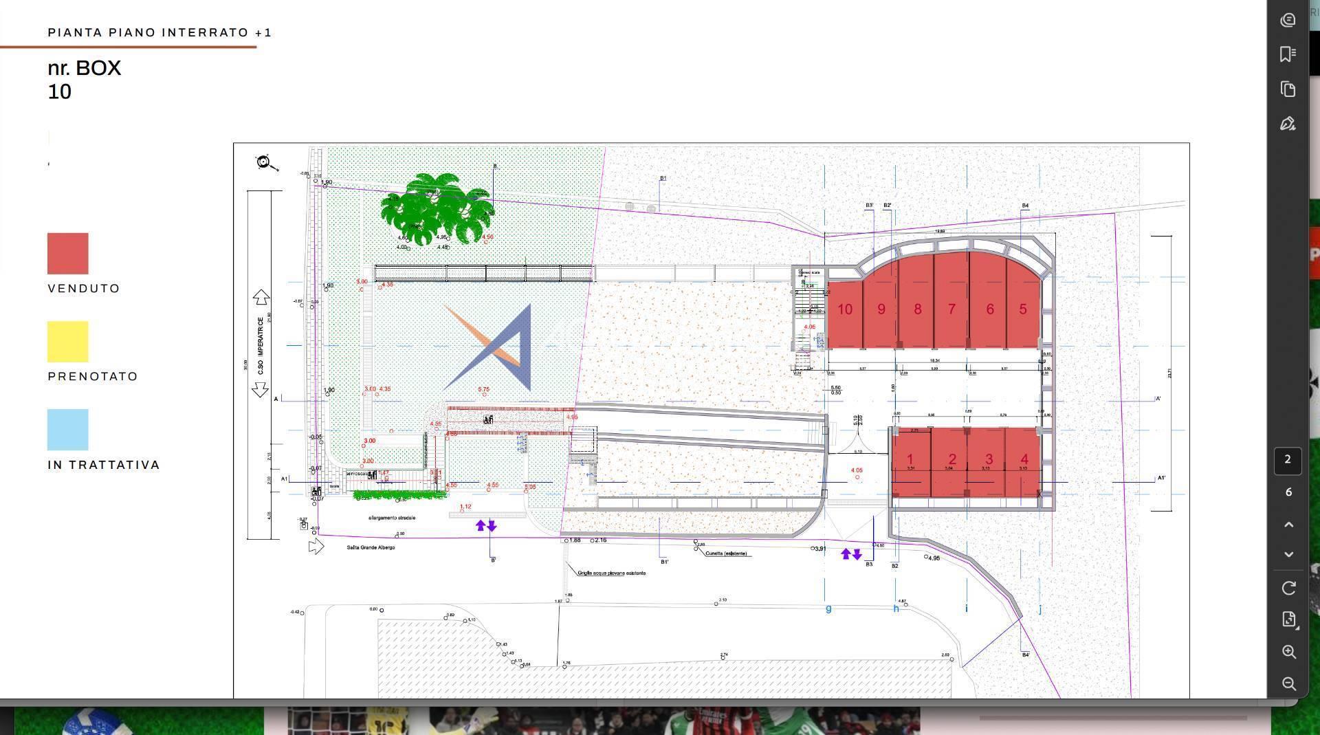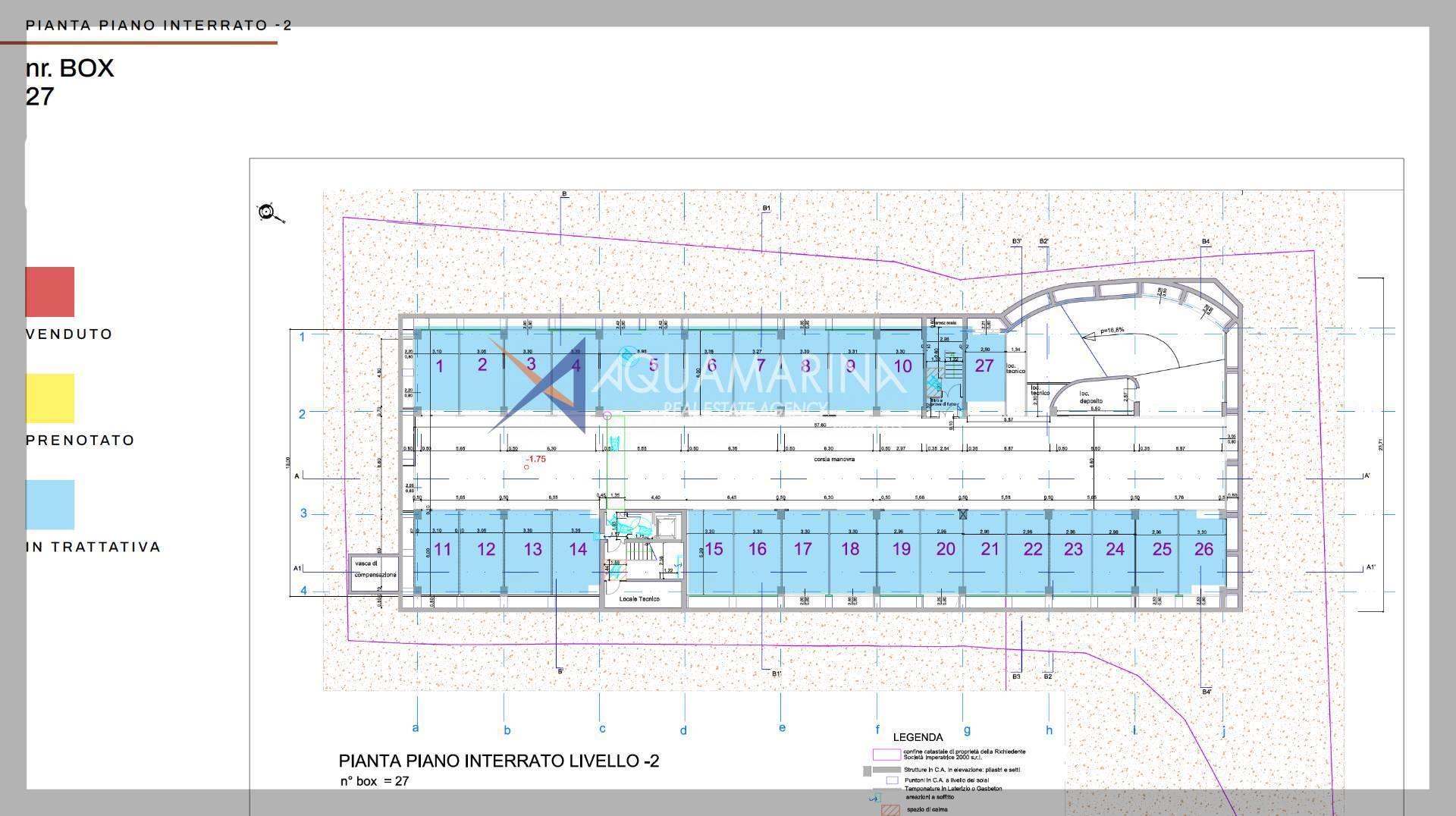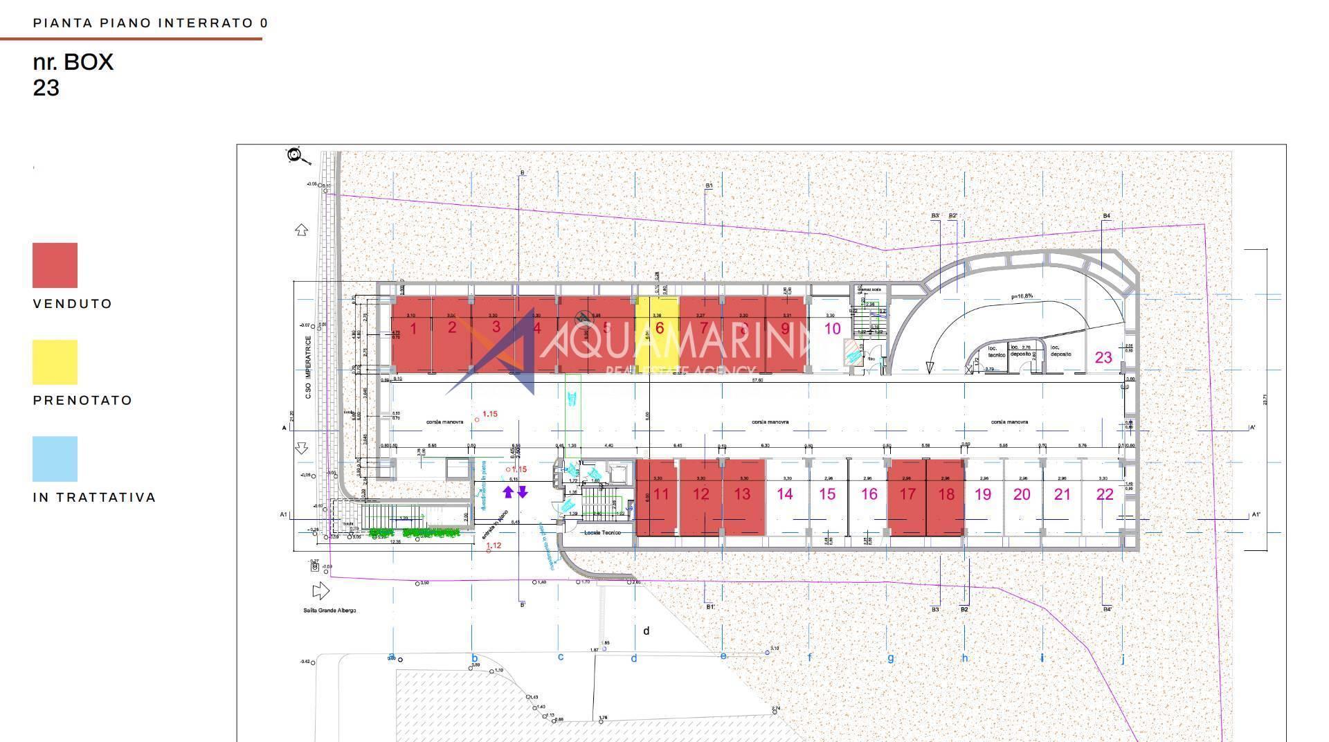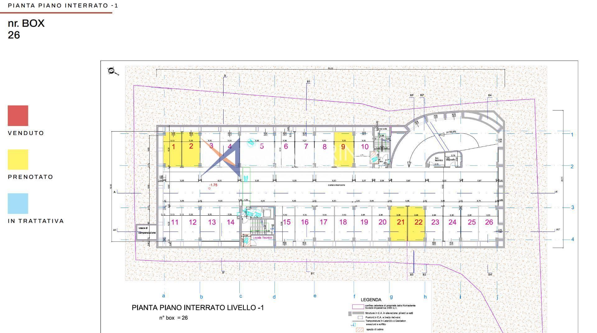 Sanremo C.so Imperatrice, Garage mit dazugehörigen Boxen, mit insgesamt 86 Boxen. Auf städtebaulicher Ebene fällt der Standort in einen der zentralsten Stadtkontexte, der für seine hohe Qualität sowohl in Bezug auf Landschaft und Umwelt als auch auf Architektur bekannt ist, nämlich das Gebiet der Grand Hotels des späten 19. und frühen 20. Jahrhunderts, die im eklektischen Stil mit dekorativen Elementen im Jugendstil erbaut wurden. Die Garage ist vollständig in die beiden Terrassen eingebettet und ihre Existenz ist von außen nur durch die Anwesenheit der beiden Ein- und Ausgänge erkennbar. Es erstreckt sich über drei Stockwerke von identischer Form und Größe und verfügt darüber über eine vierte Ebene mit deutlich kleineren Abmessungen.