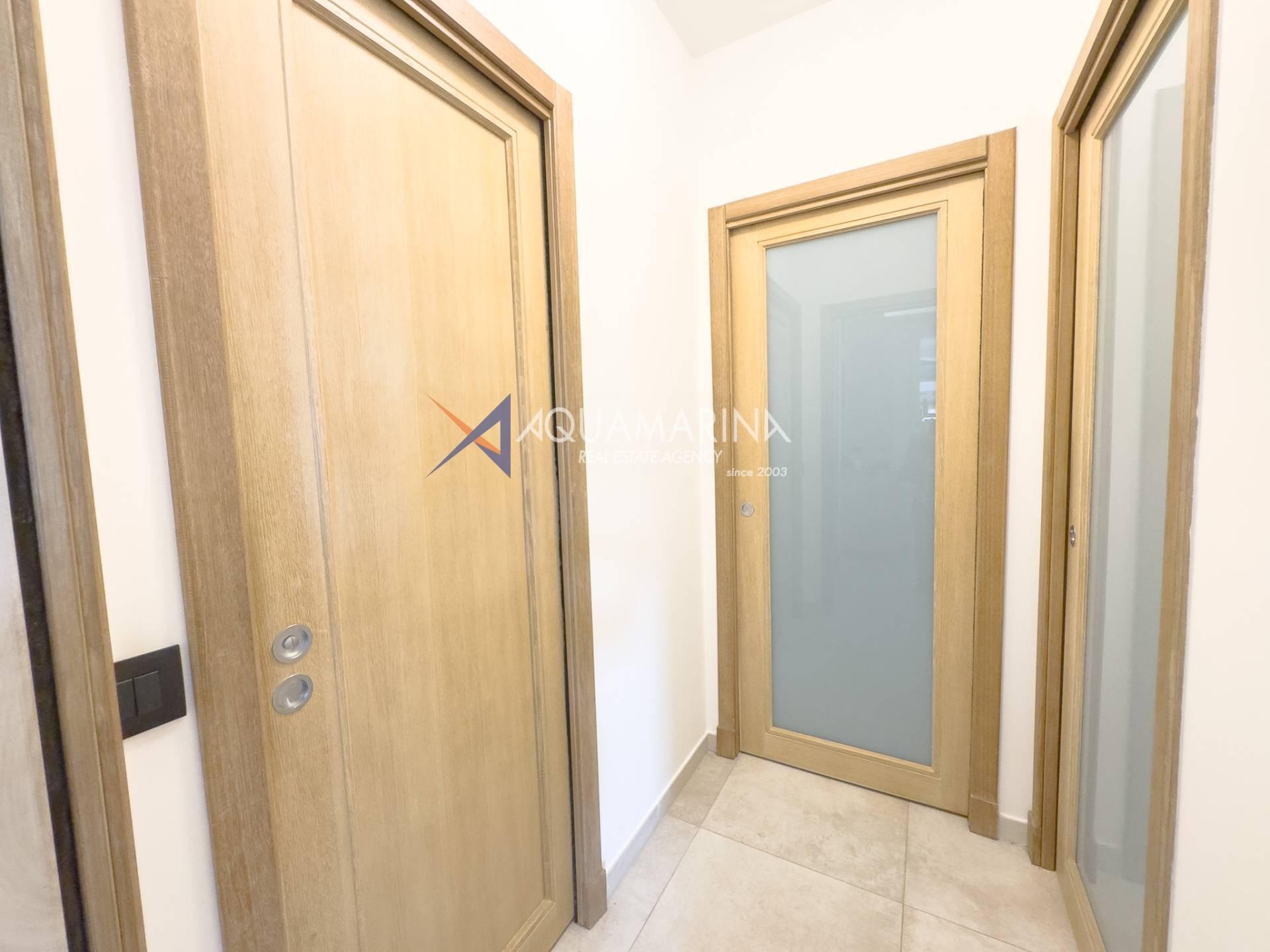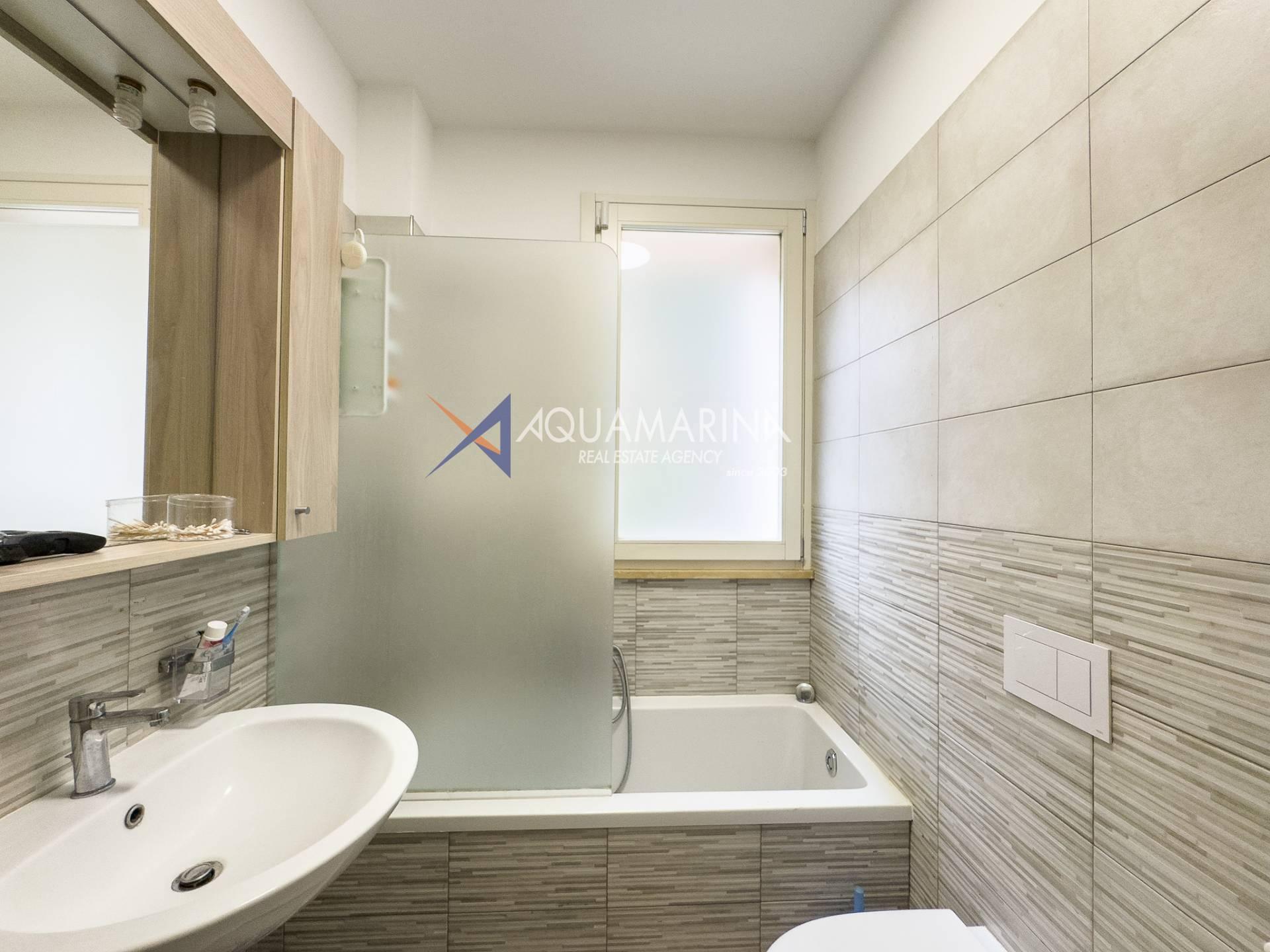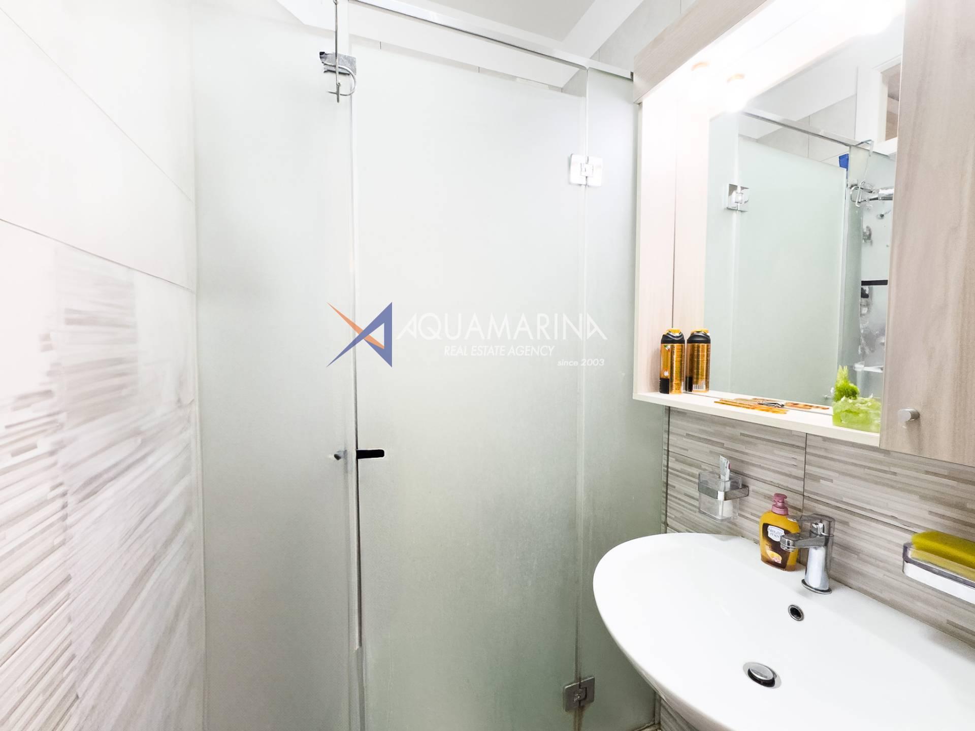 Eine geräumige Wohnung von ca. 70 Quadratmetern in gutem Zustand, im Erdgeschoss gelegen und mit privatem Garten. Die Wohnung besteht aus einem Eingangsbereich, einem Wohnzimmer mit Küchenzeile, einem Flur, einer Loggia, zwei Schlafzimmern und zwei Badezimmern. Sie verfügt außerdem über eine 40 Quadratmeter große Außenterrasse und Zugang zu einem großen, ca. 100 Quadratmeter großen Garten.
