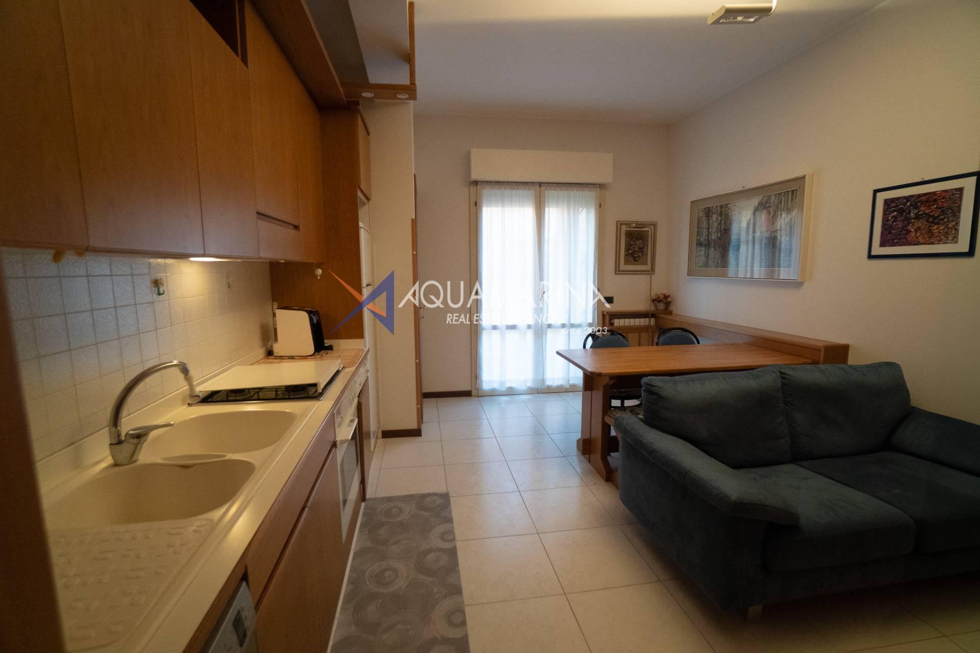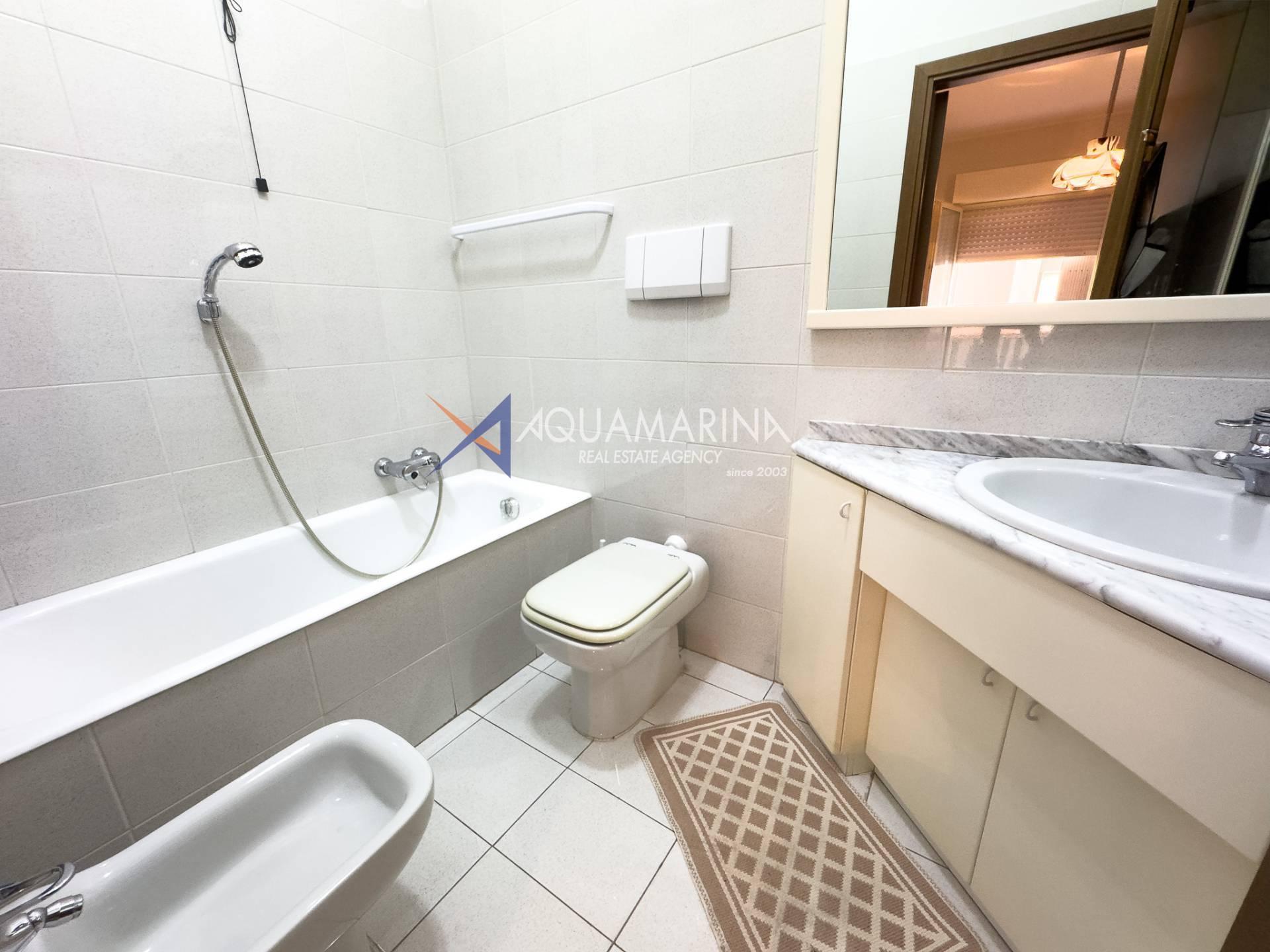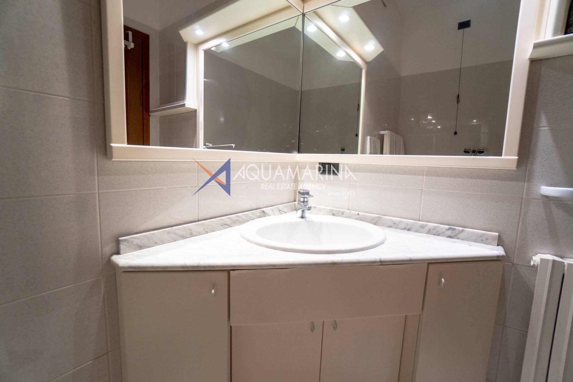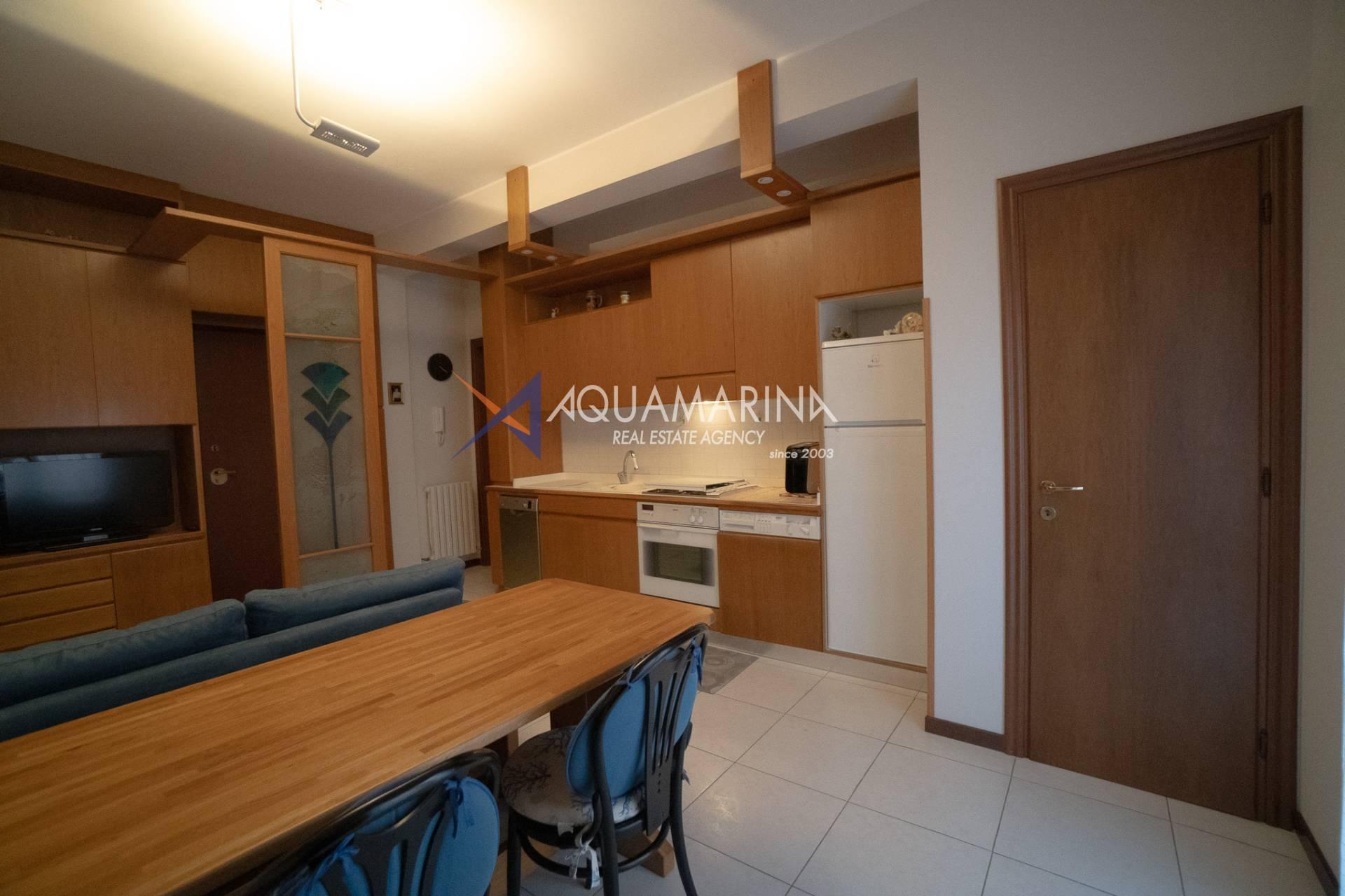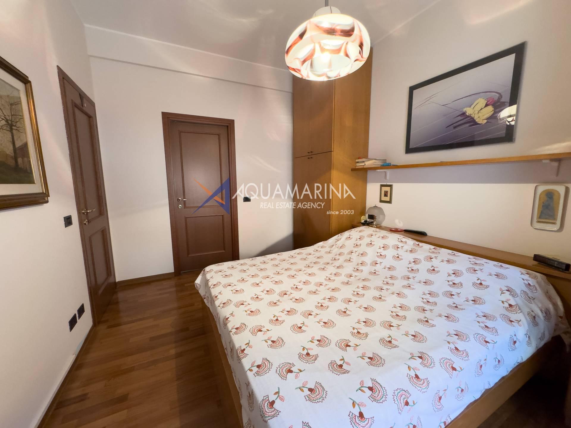 Die Wohnung befindet sich im zweiten Stock und besteht aus einem direkten Zugang zu einem hellen Wohnzimmer mit Kochnische, das sich direkt zur Terrasse öffnet und so einen fließenden Übergang zwischen Innen- und Außenraum schafft, zwei Schlafzimmern, eines davon mit eigenem Bad, und einem zweiten Badezimmer.