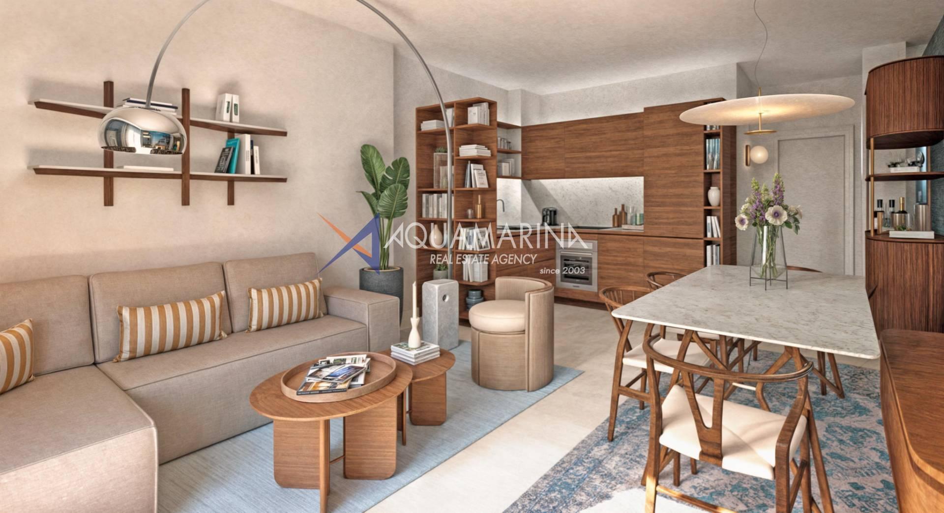 Die Wohnung besteht aus einer Eingangshalle, einem großen Wohnbereich mit offener Küche, einem Hauswirtschaftsraum/Waschküche, Schlafzimmern mit begehbaren Kleiderschränken, einem Badezimmer und einer 10 m² großen Terrasse mit teilweisem Meerblick.