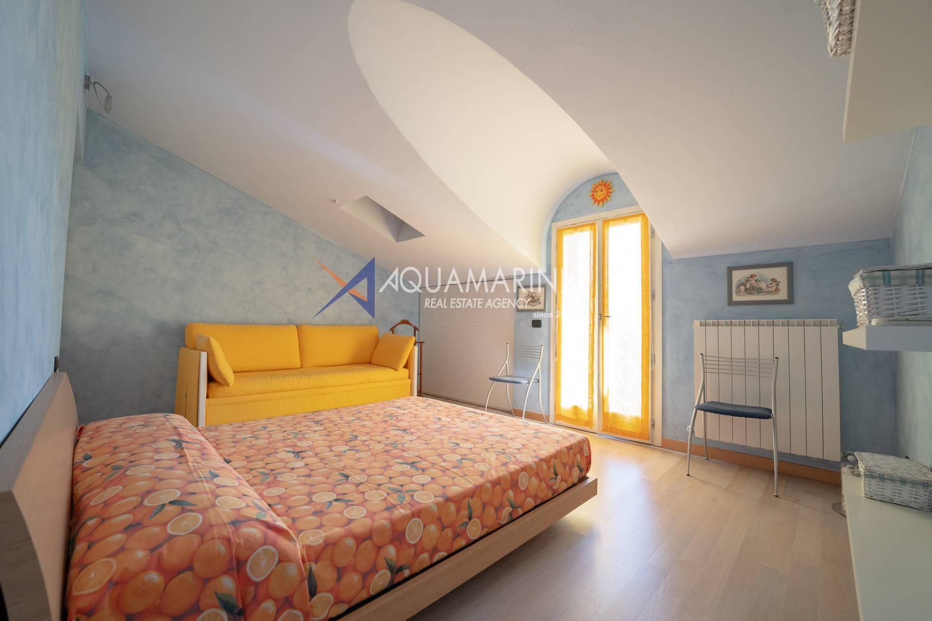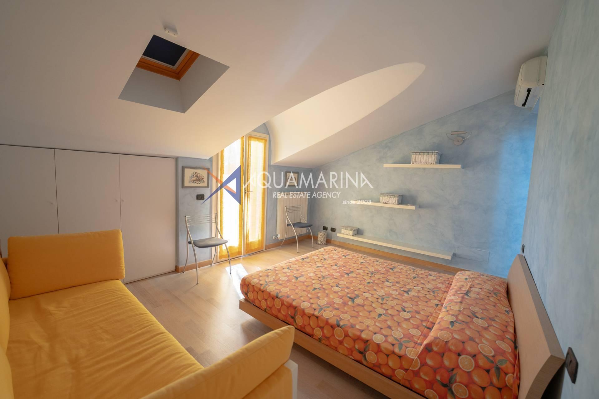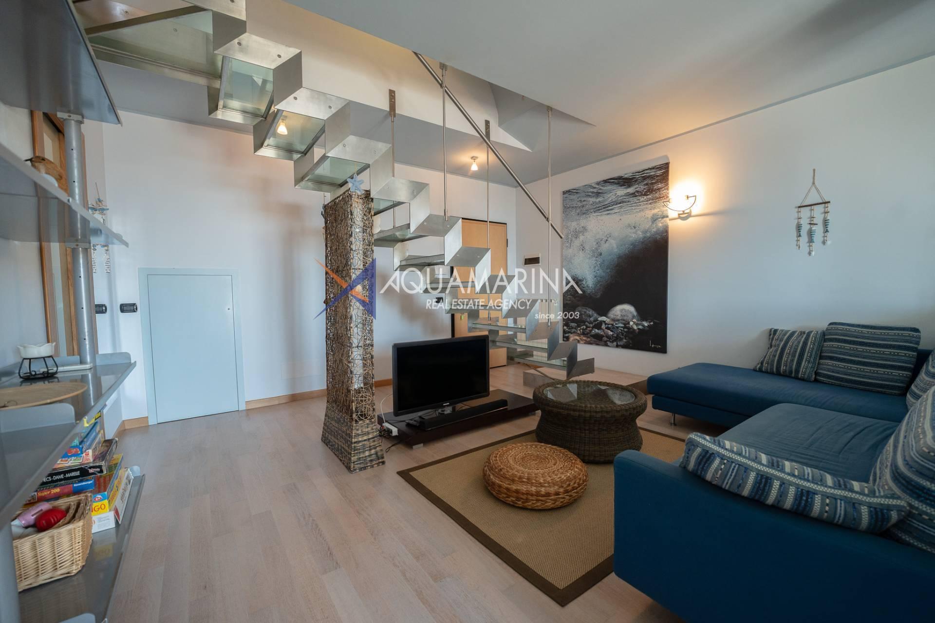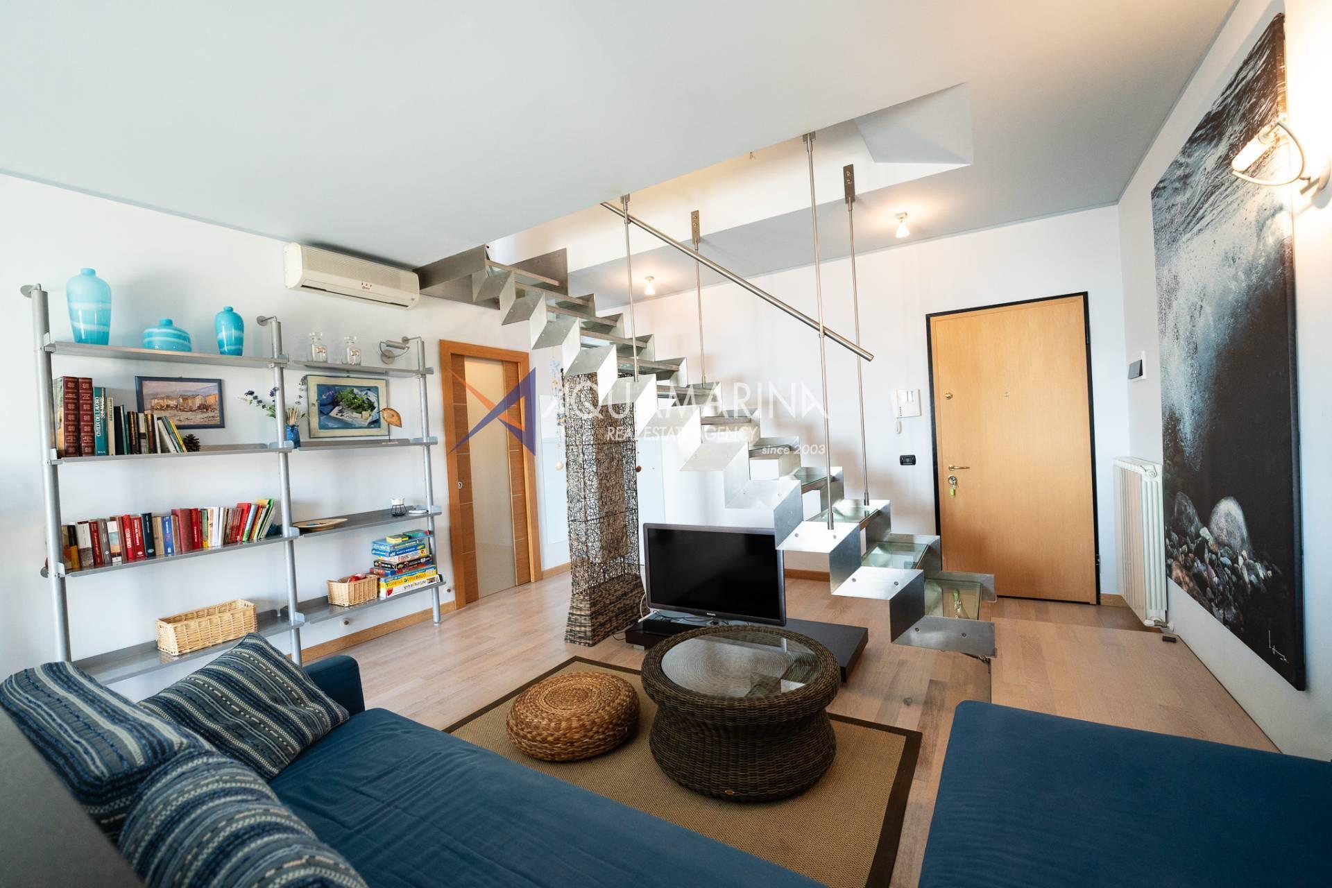 Die Wohnung ist ca. 110 Quadratmeter groß und erstreckt sich über zwei Ebenen, bestehend aus: Eingang mit angenehmem und einladendem Wohnzimmer, offener Küche, bewohnbarer Terrasse von ca. sieben Quadratmetern mit herrlichem Blick auf das Meer und die Stadt, Flur, Flur mit die Einbauschränke und das erste Schlafzimmer, Badezimmer mit Fenster und Dusche.