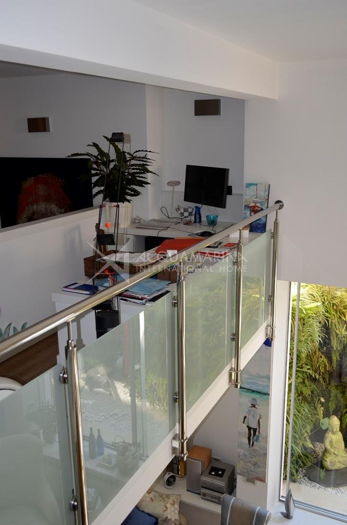 Im ersten Zwischengeschoss finden wir einen großen offenen Raum mit Galerie und Doppelzimmer mit eigenem Bad.