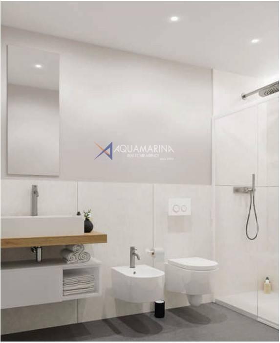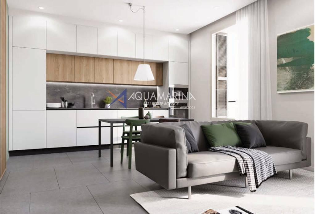 Die Wohnung bietet einen hellen Wohnbereich mit direktem Zugang zur Terrasse, perfekt um den Meerblick und schöne Tage im Freien zu genießen. Die Bodenbeläge und Beläge sind vollständig anpassbar, wobei eine große Auswahl an Mustern bereits vor Ort verfügbar ist, um die Umgebung zu schaffen, die Ihren Stil am besten widerspiegelt.
