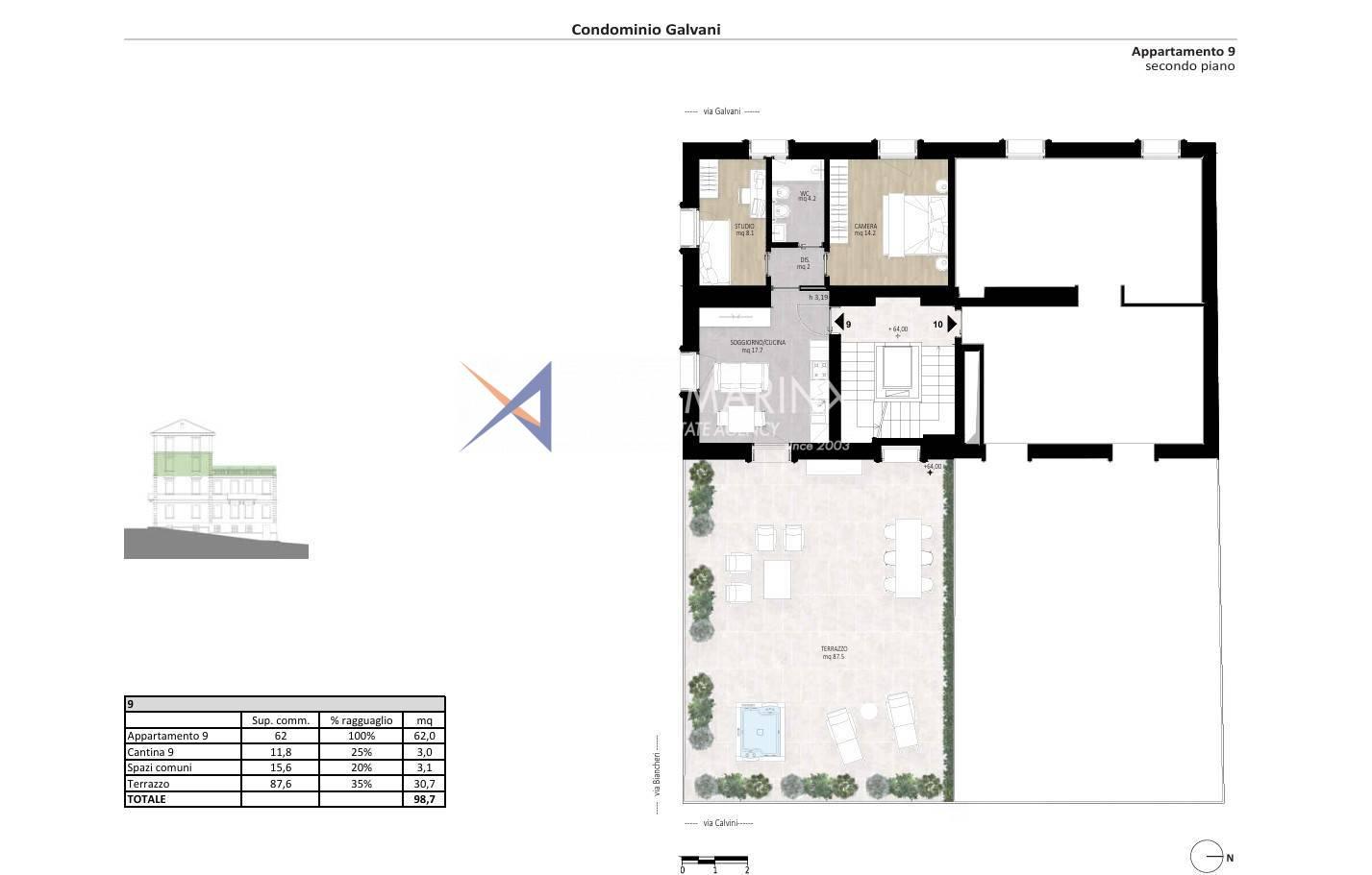 Darüber hinaus ist die Eigentumswohnung „Galvani" mit Photovoltaik-Paneelen ausgestattet, die die Energieunabhängigkeit der öffentlichen Bereiche, einschließlich des Aufzugs, gewährleisten, wodurch die Verwaltungskosten gesenkt und zur ökologischen Nachhaltigkeit beigetragen werden.