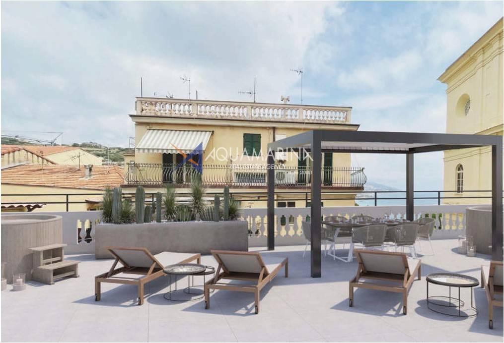 Elegante Dreizimmerwohnung im zweiten Stock mit großer Panoramaterrasse mit Meerblick und entsprechendem Keller.