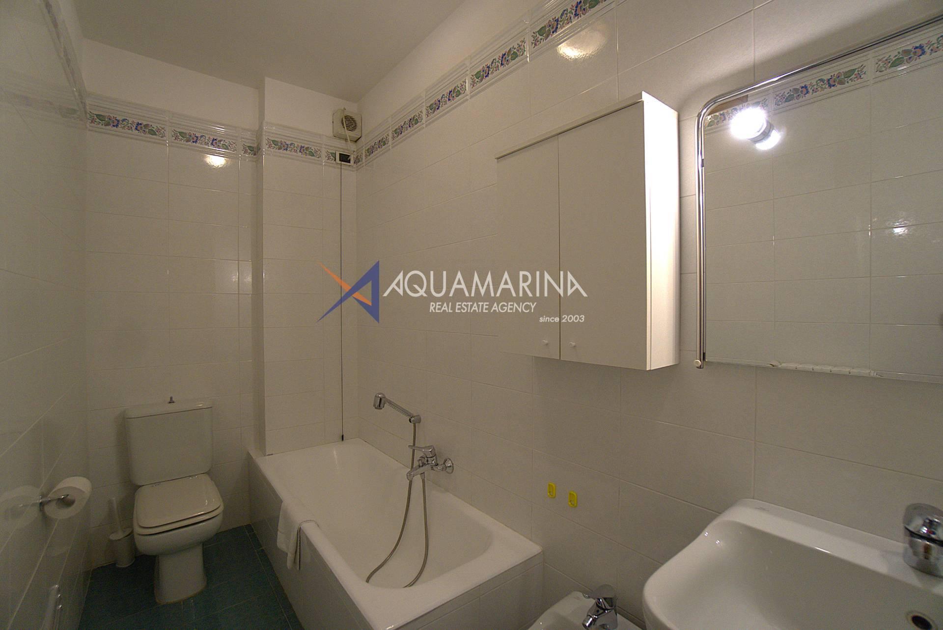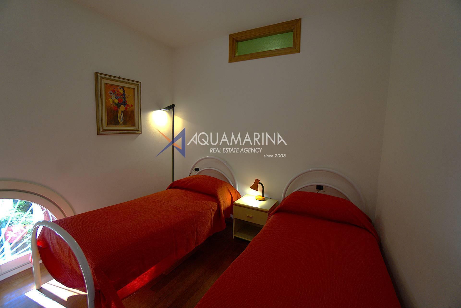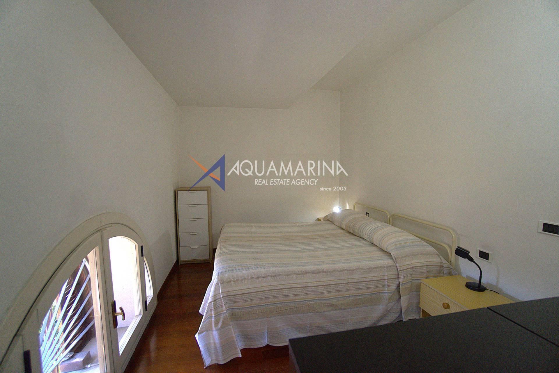 Im ersten Stock befindet sich ein geräumiges und helles Wohnzimmer mit Kochnische, das sich zur Terrasse mit einem reizvollen und entspannenden Blick auf den Park und den Pool öffnet. Auf dieser Ebene befindet sich außerdem ein Badezimmer mit Dusche, das vom Wohnbereich aus zugänglich ist.
