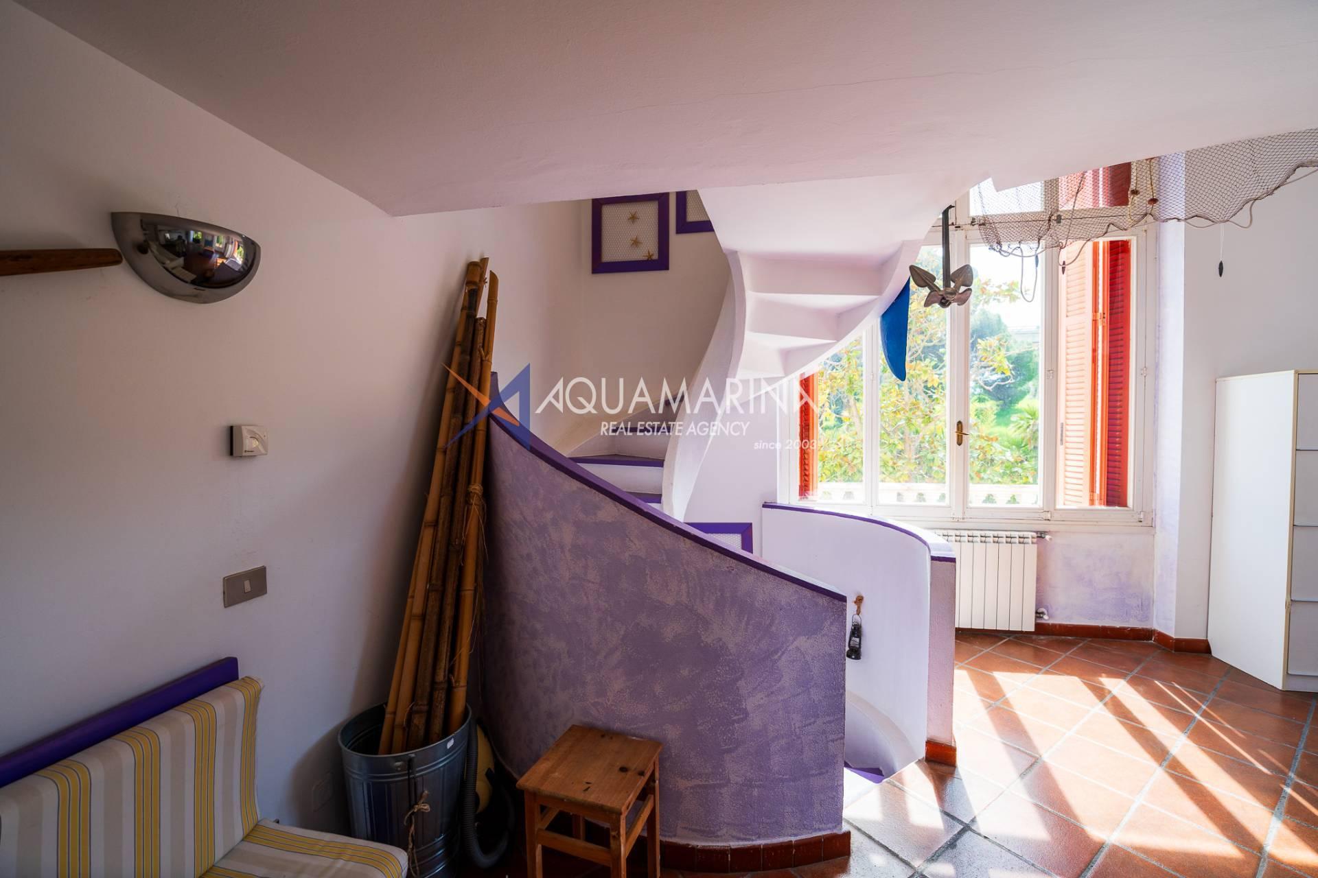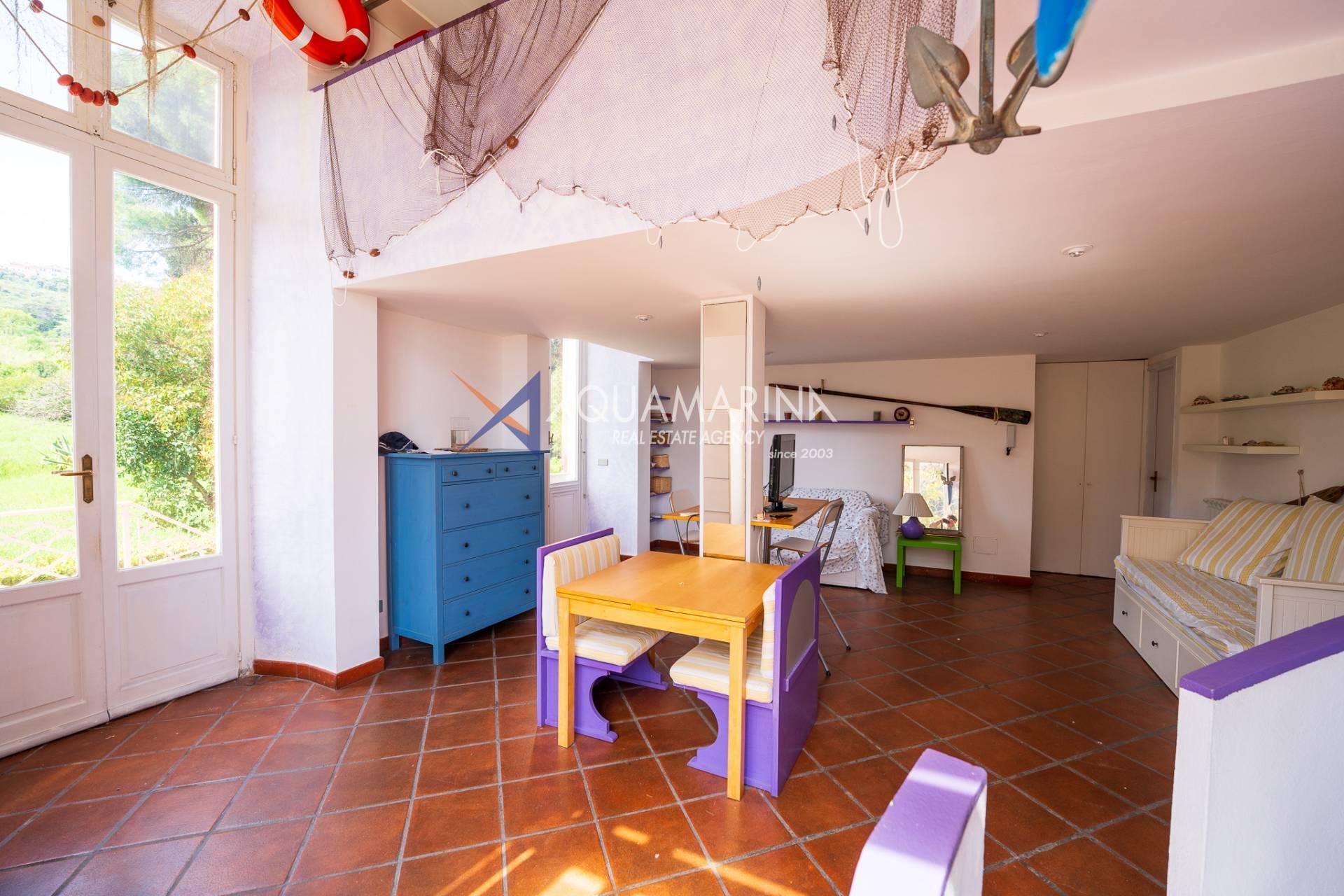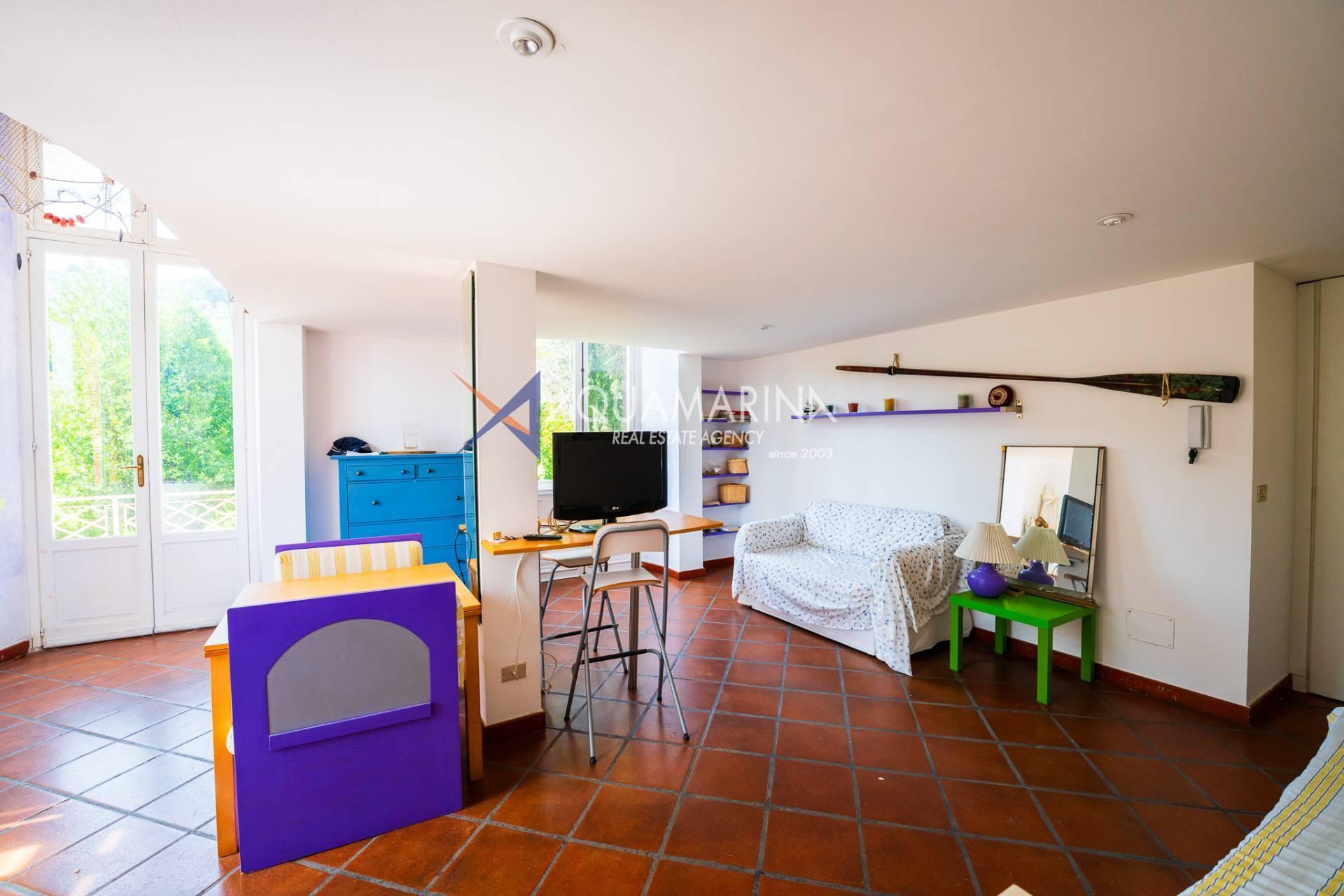 Erdgeschoss (50 m2): Wohnbereich mit zwei Schlafsofas, Badezimmer und großem Schrank. Von hier aus gelangt man auf eine Terrasse mit Blick auf zwei Seiten und teilweisem Blick auf das Meer und den Park. Abgerundet wird dieser Bereich durch einen exklusiven 100 m2 großen Garten, der sich perfekt für Abendessen im Freien und unvergessliche Momente eignet.