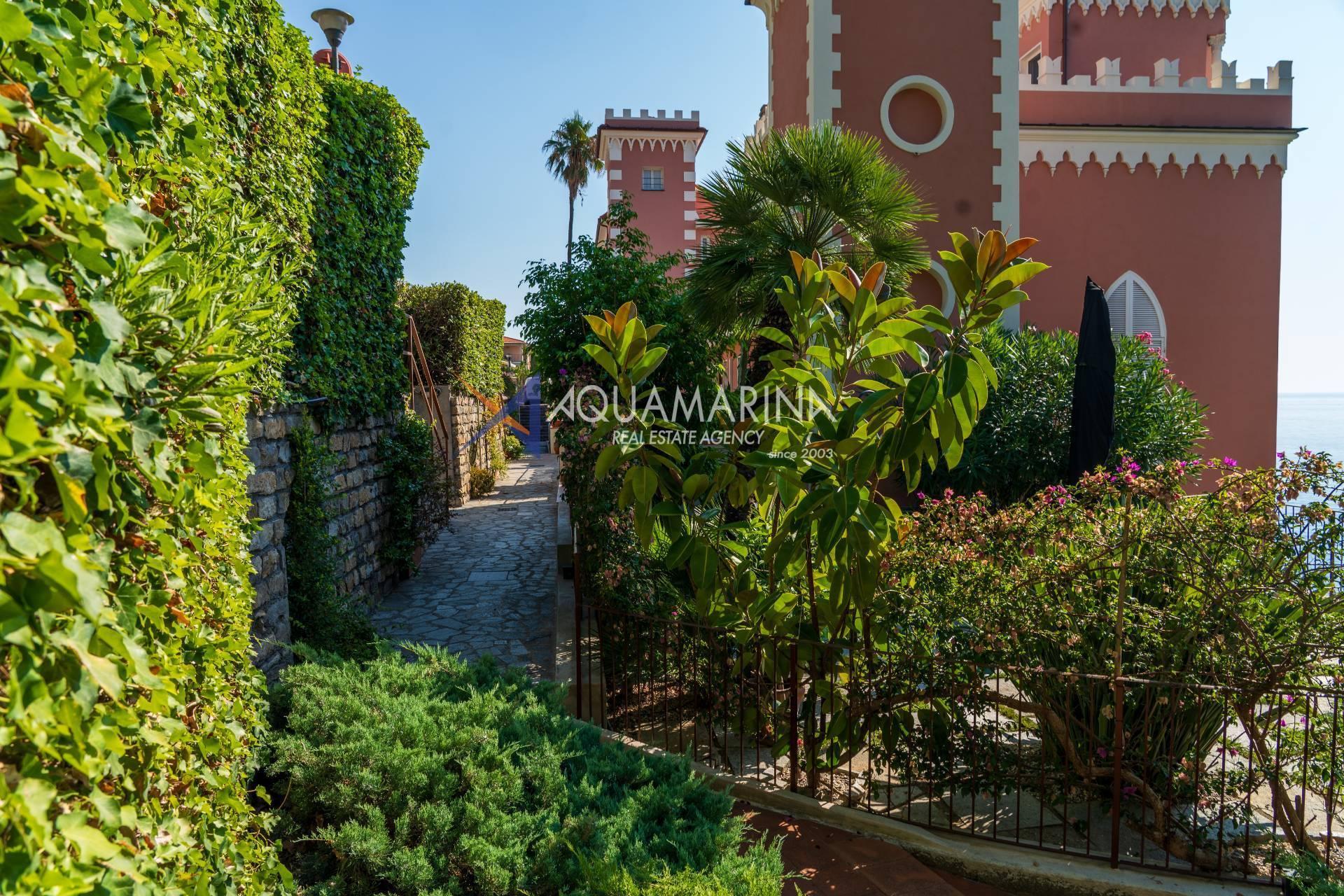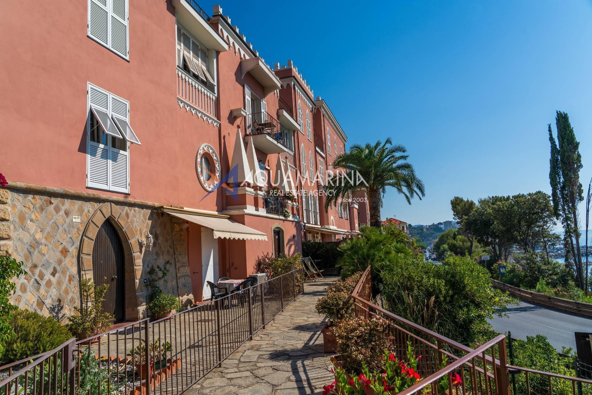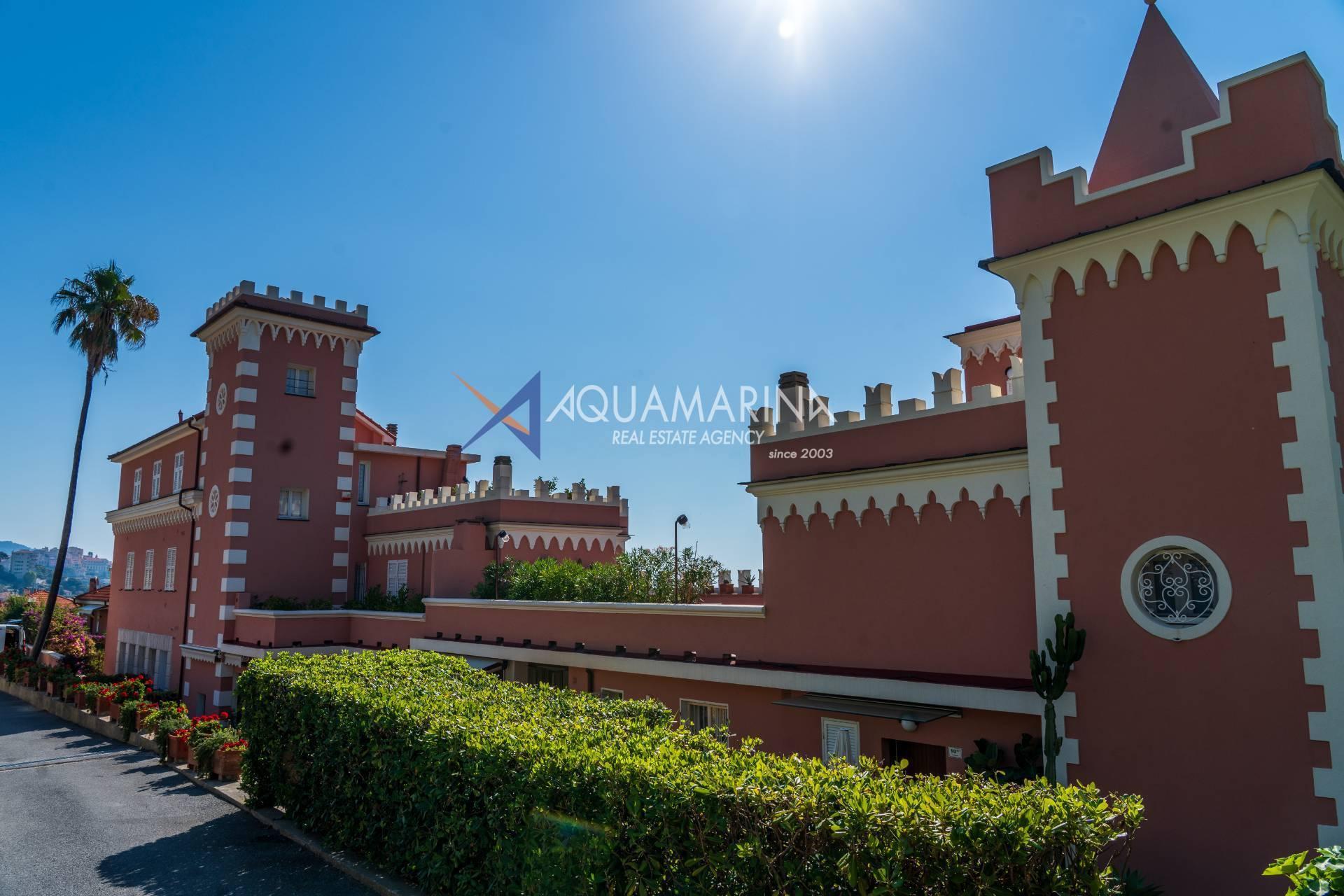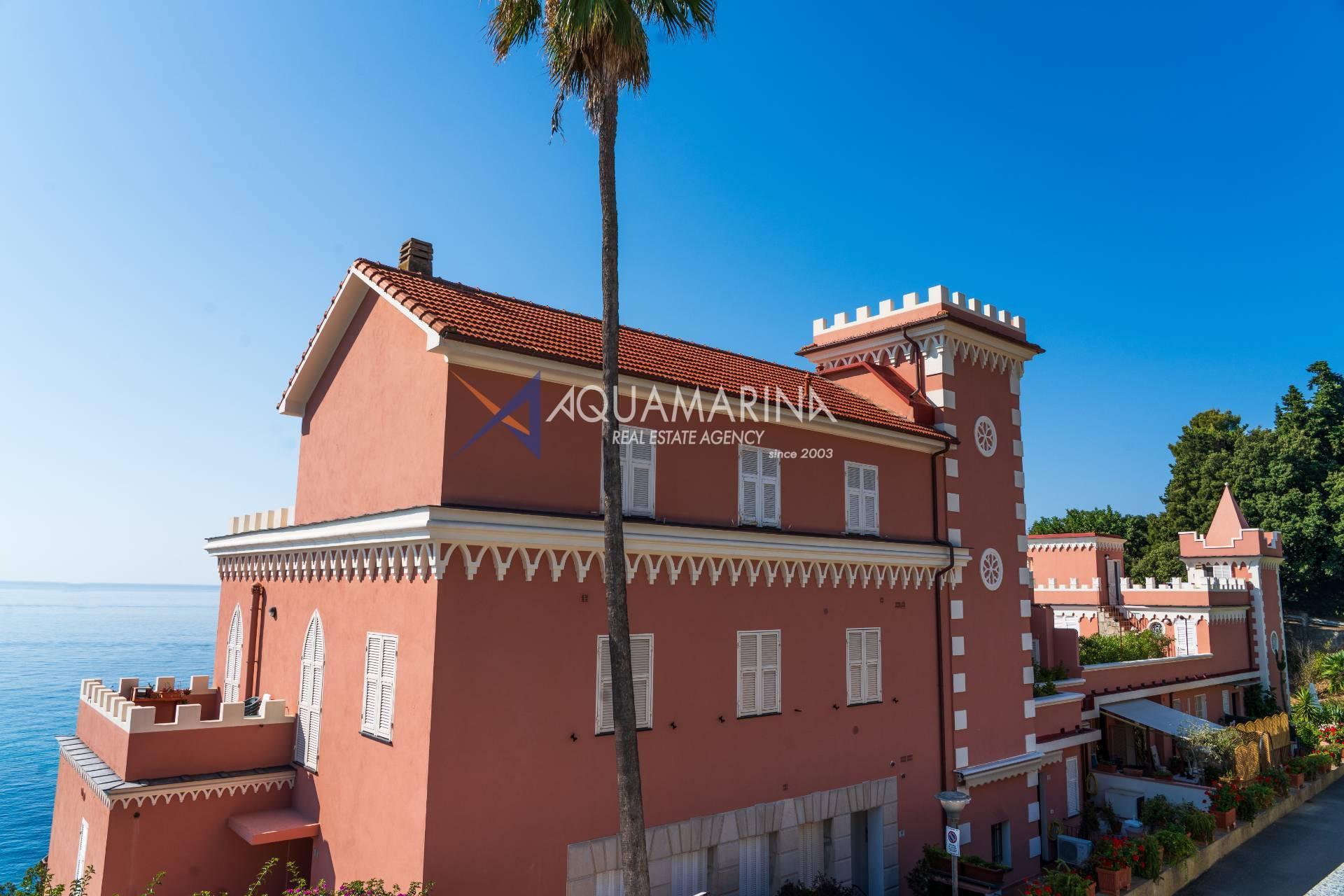 Imperia Meerblick-Apartment. Dieses exklusive Apartment bietet einen Panoramablick auf das Meer und einen privaten Innenhof in einer einzigartigen Umgebung. Das Anwesen befindet sich in der Villa Ludovici, einer kürzlich restaurierten historischen Residenz aus den 1900er Jahren. Es besticht durch seine exquisiten architektonischen Details, darunter Türme, Fenster und Spitzbogentüren, die an die ursprüngliche Zeit erinnern.