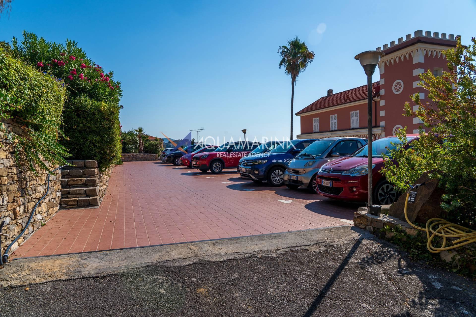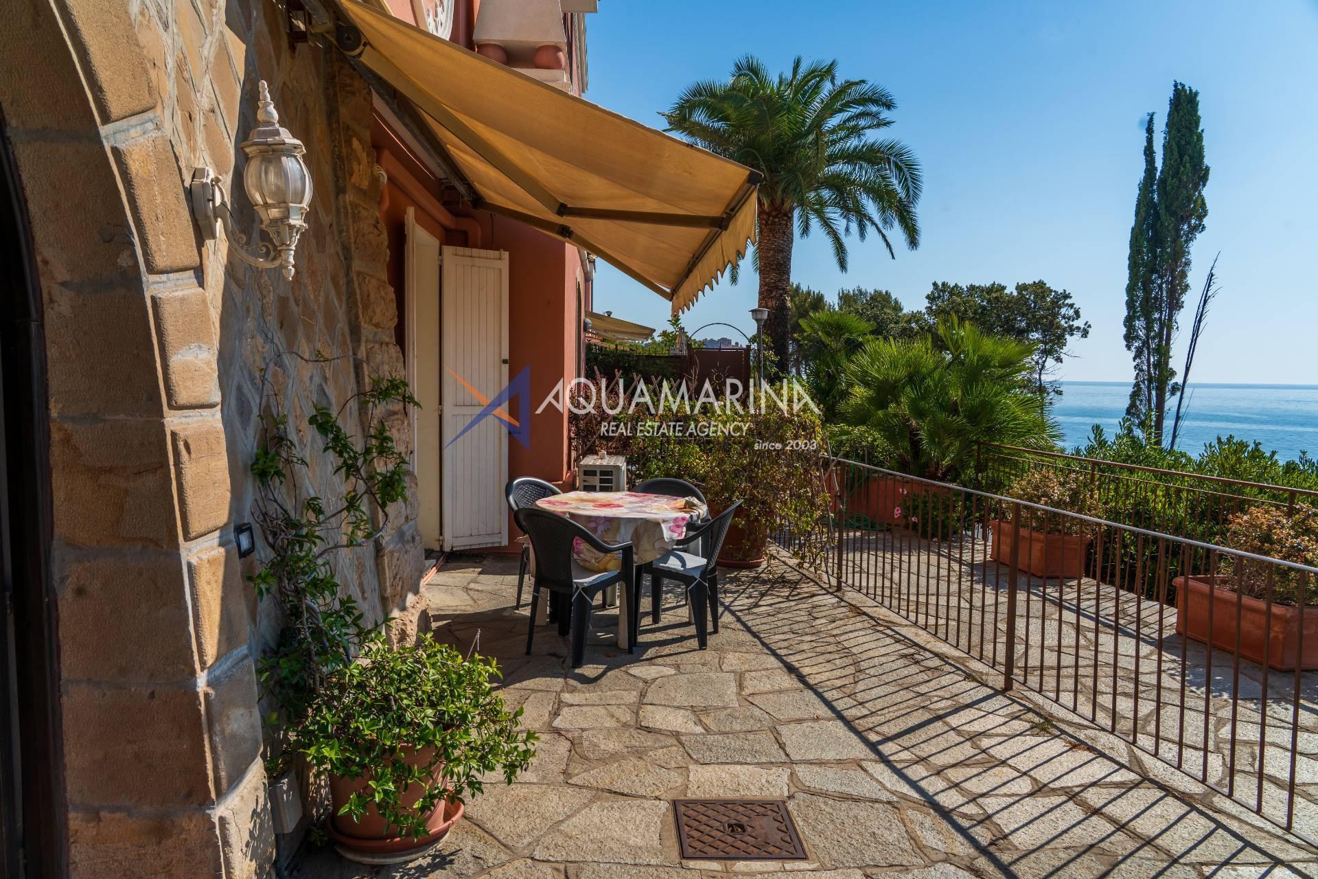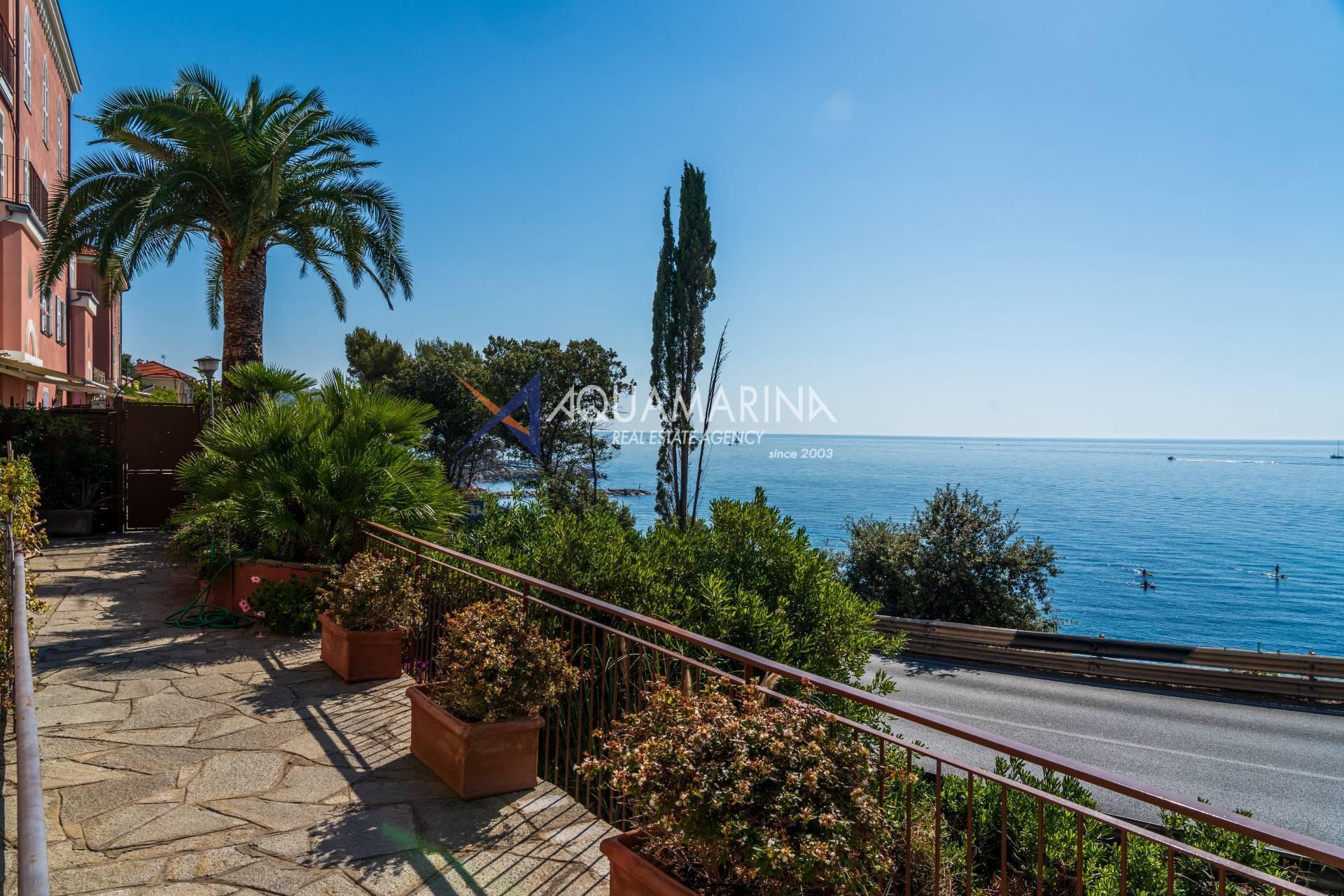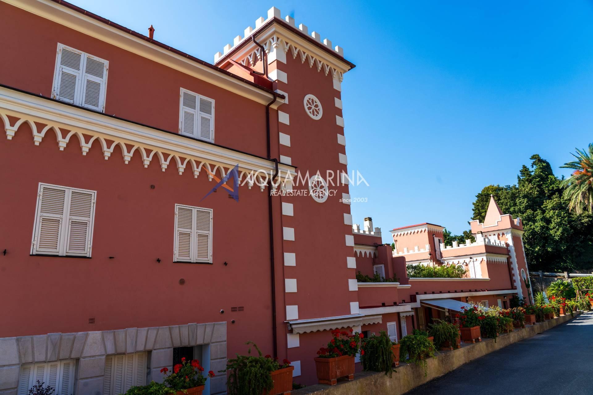 Imperia Meerblick-Apartment. Dieses exklusive Apartment bietet einen Panoramablick auf das Meer und einen privaten Innenhof in einer einzigartigen Umgebung. Das Anwesen befindet sich in der Villa Ludovici, einer kürzlich restaurierten historischen Residenz aus den 1900er Jahren. Es besticht durch seine exquisiten architektonischen Details, darunter Türme, Fenster und Spitzbogentüren, die an die ursprüngliche Zeit erinnern.