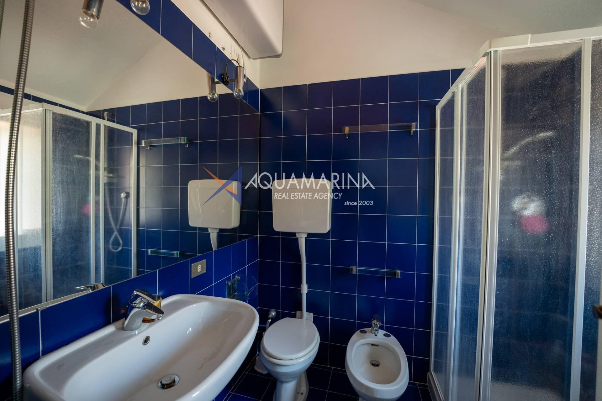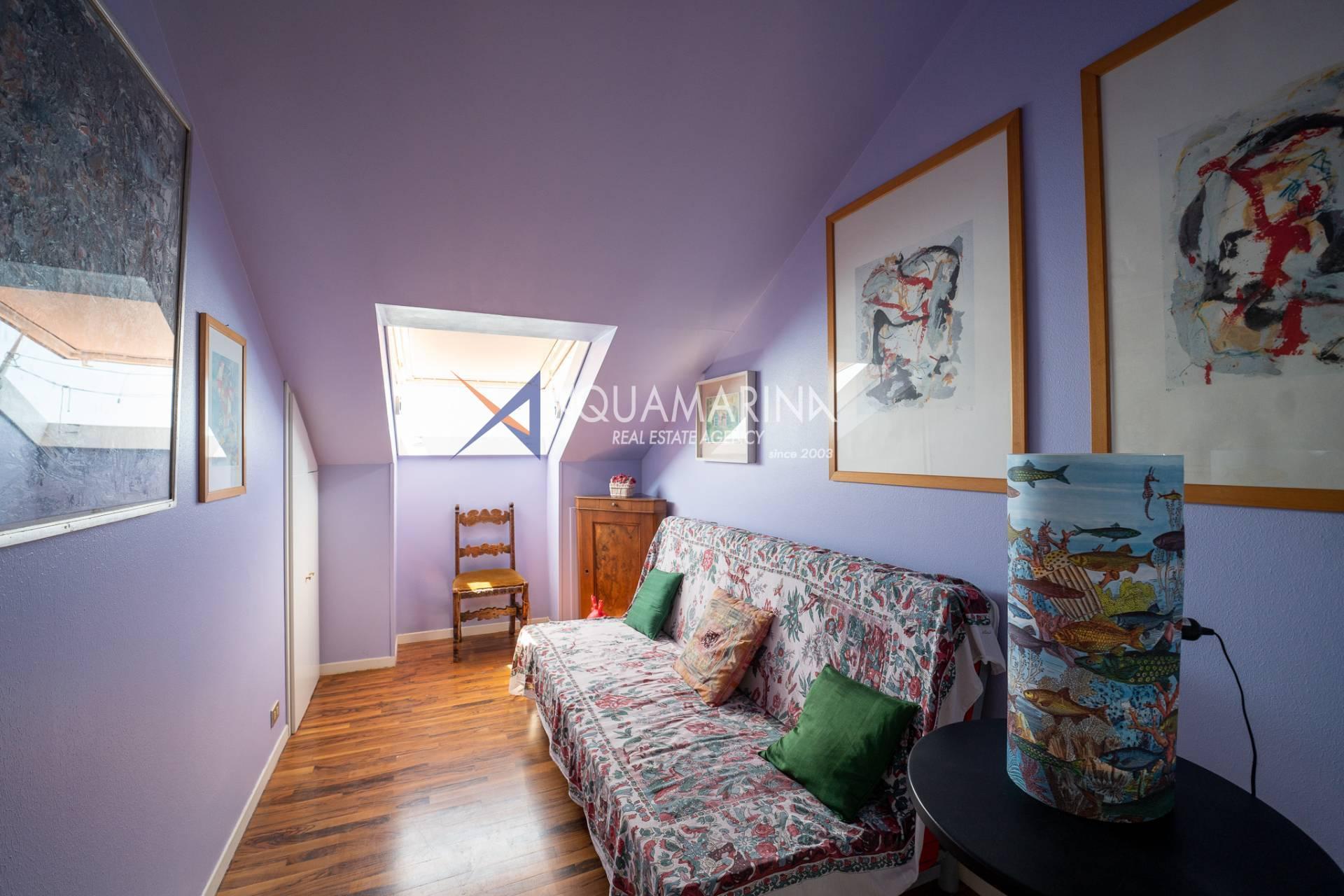 Die Wohnung besteht aus einem direkten Eingang in das geräumige Wohnzimmer mit Küchenzeile, das mit großen Fenstern nach Süden ausgestattet ist, von denen aus Sie einen herrlichen Blick auf das Meer und die Stadt genießen können. Von hier aus führt eine bequeme Holztreppe zum Schlafbereich, wo sich zwei Doppelzimmer, zwei Einzelzimmer, zwei Badezimmer und ein Service befinden.