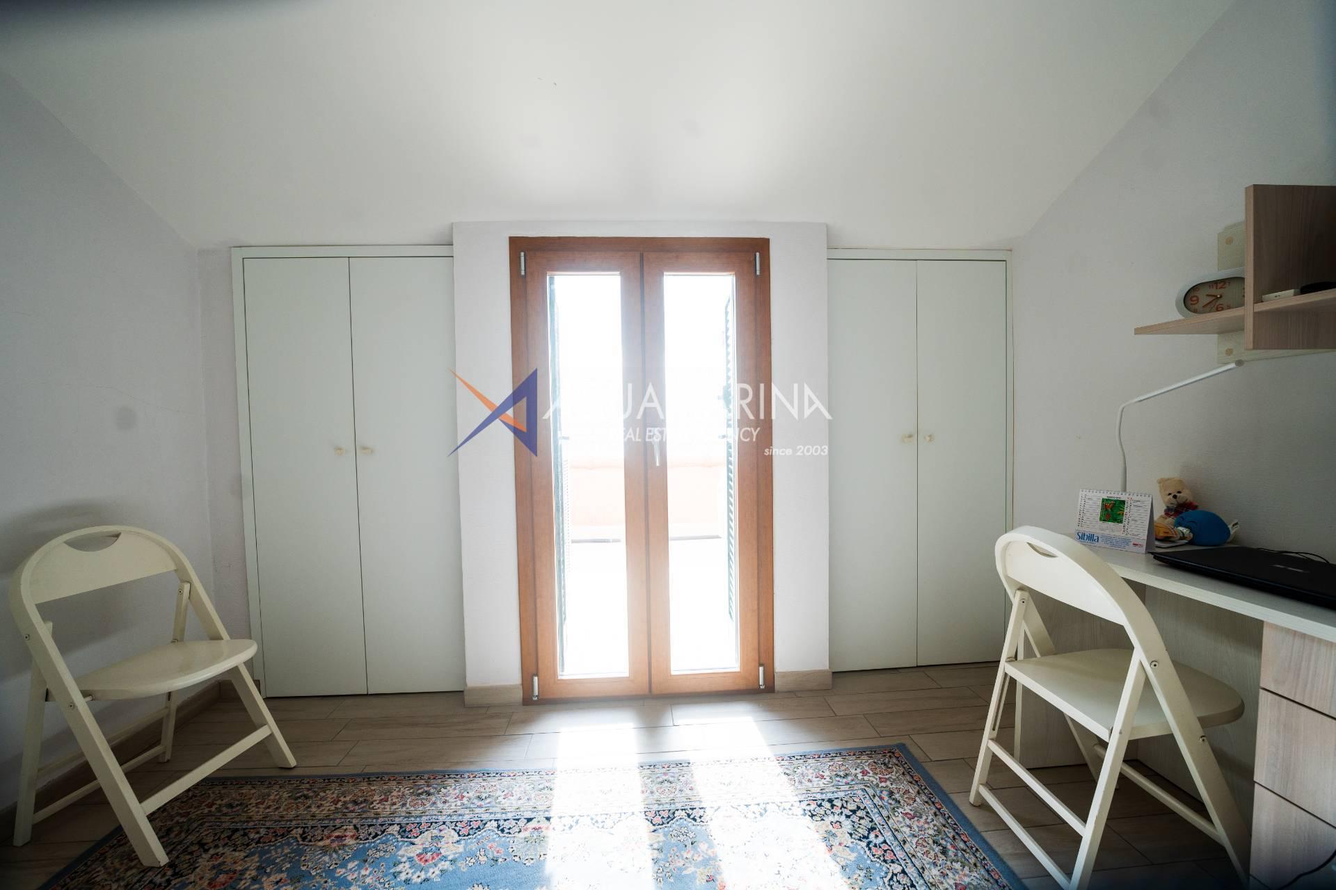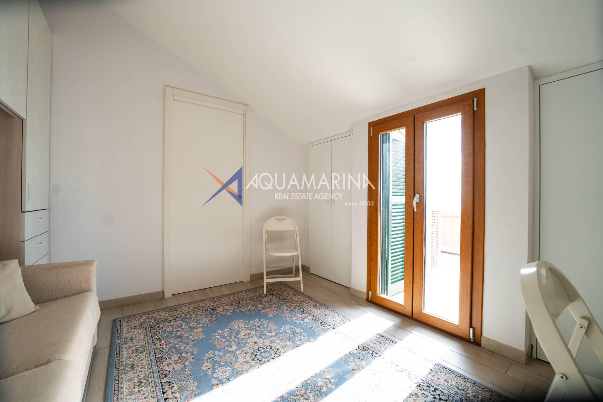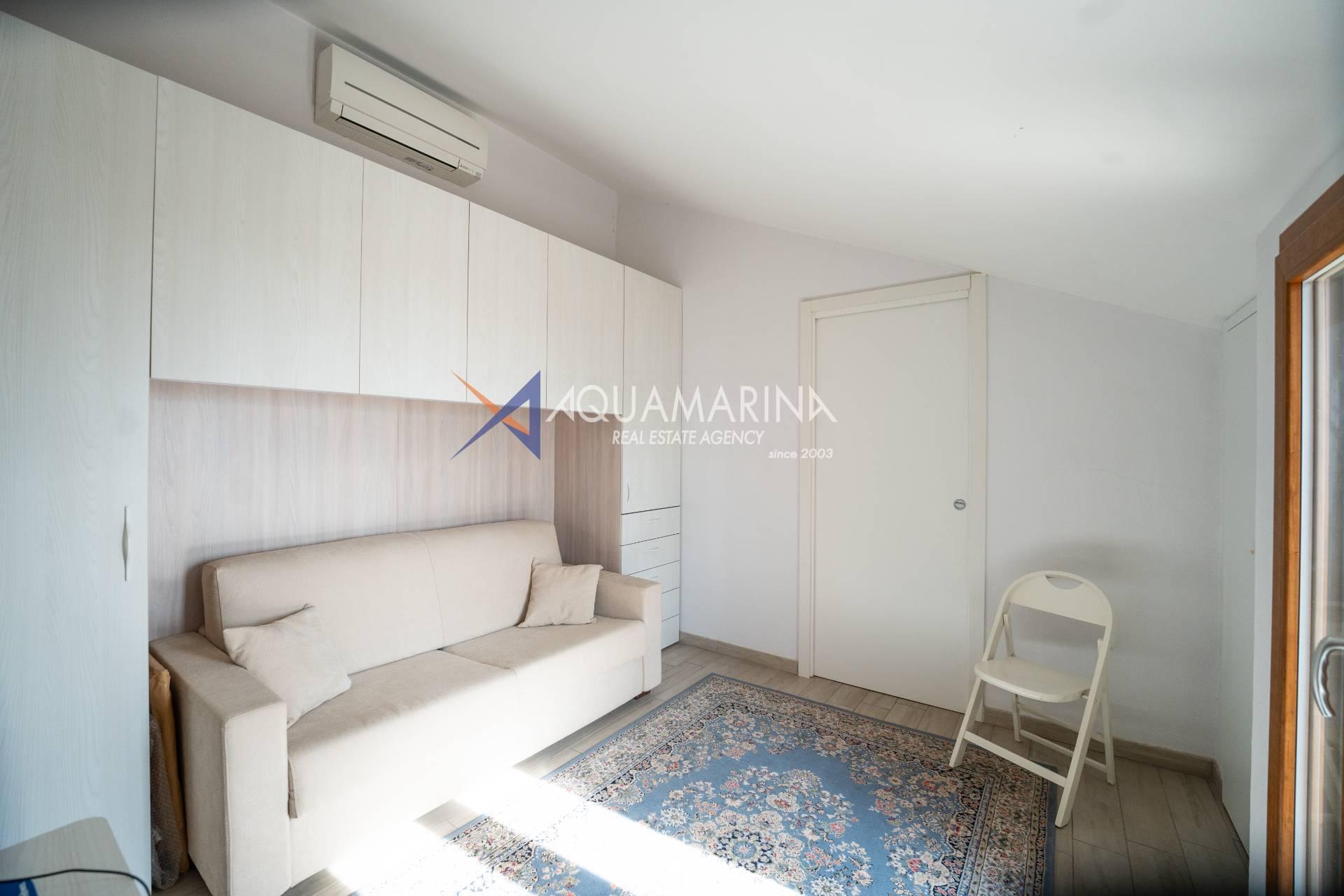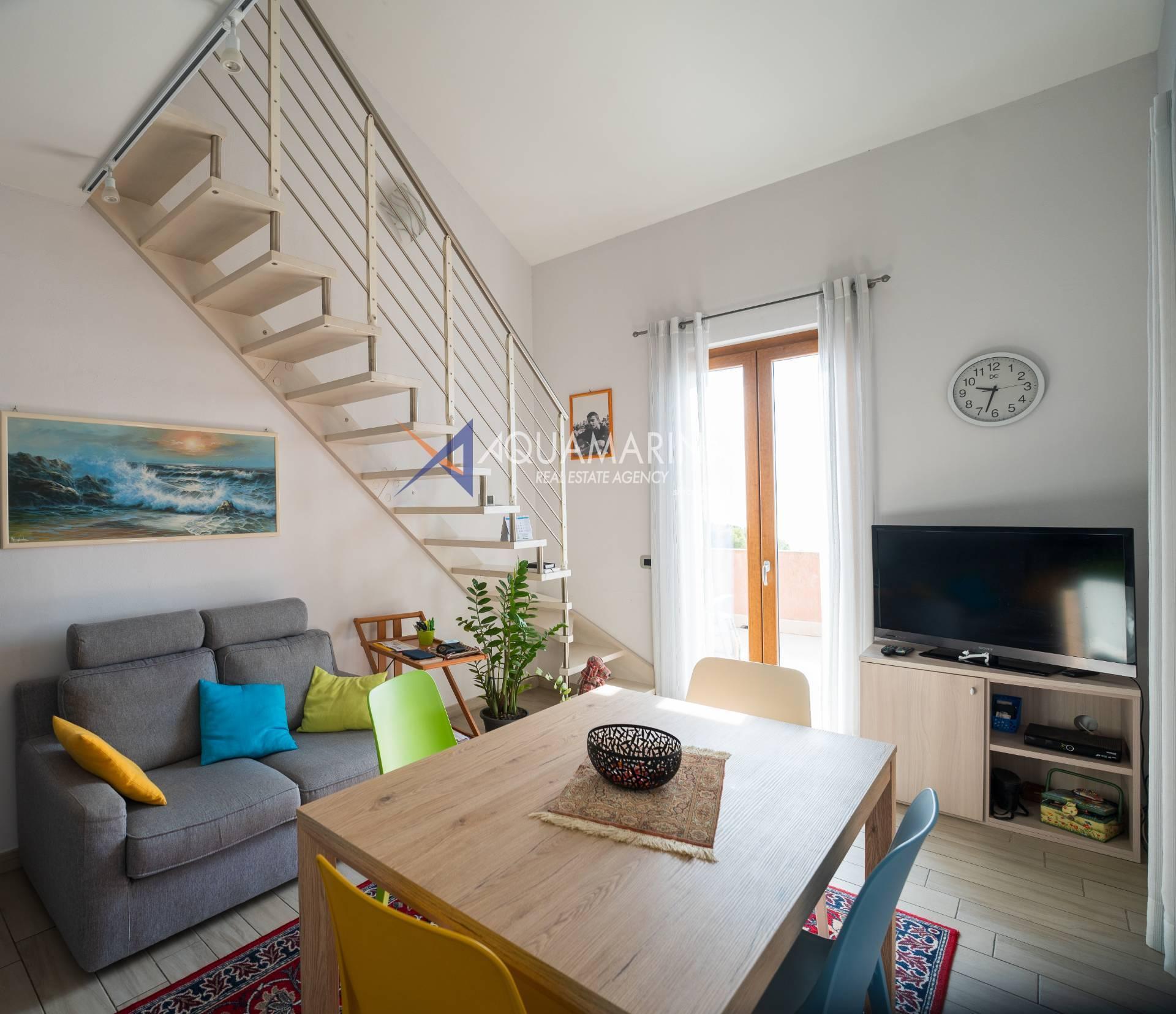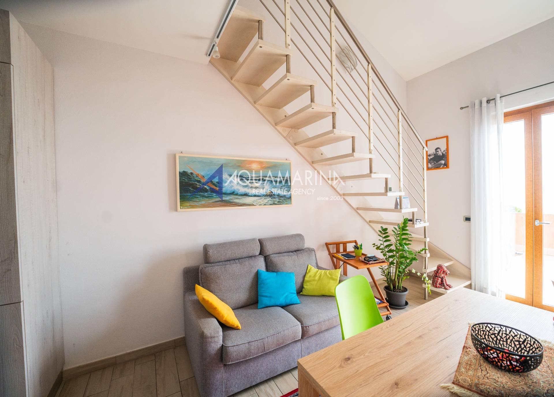 Zweite Etage: Einladender Wohneingang, der sich zu einem hellen Wohnzimmer und einer gut ausgestatteten Küche, einem Schlafzimmer, einem Badezimmer und zwei Terrassen öffnet. Beide Terrassen bieten einen unglaublichen Meerblick und eignen sich für Momente der Entspannung, Abendessen, Mittagessen und Frühstück direkt am Meer, eine Terrasse ist zudem mit einer Loggia ausgestattet, um den Außenbereich jederzeit genießen zu können.