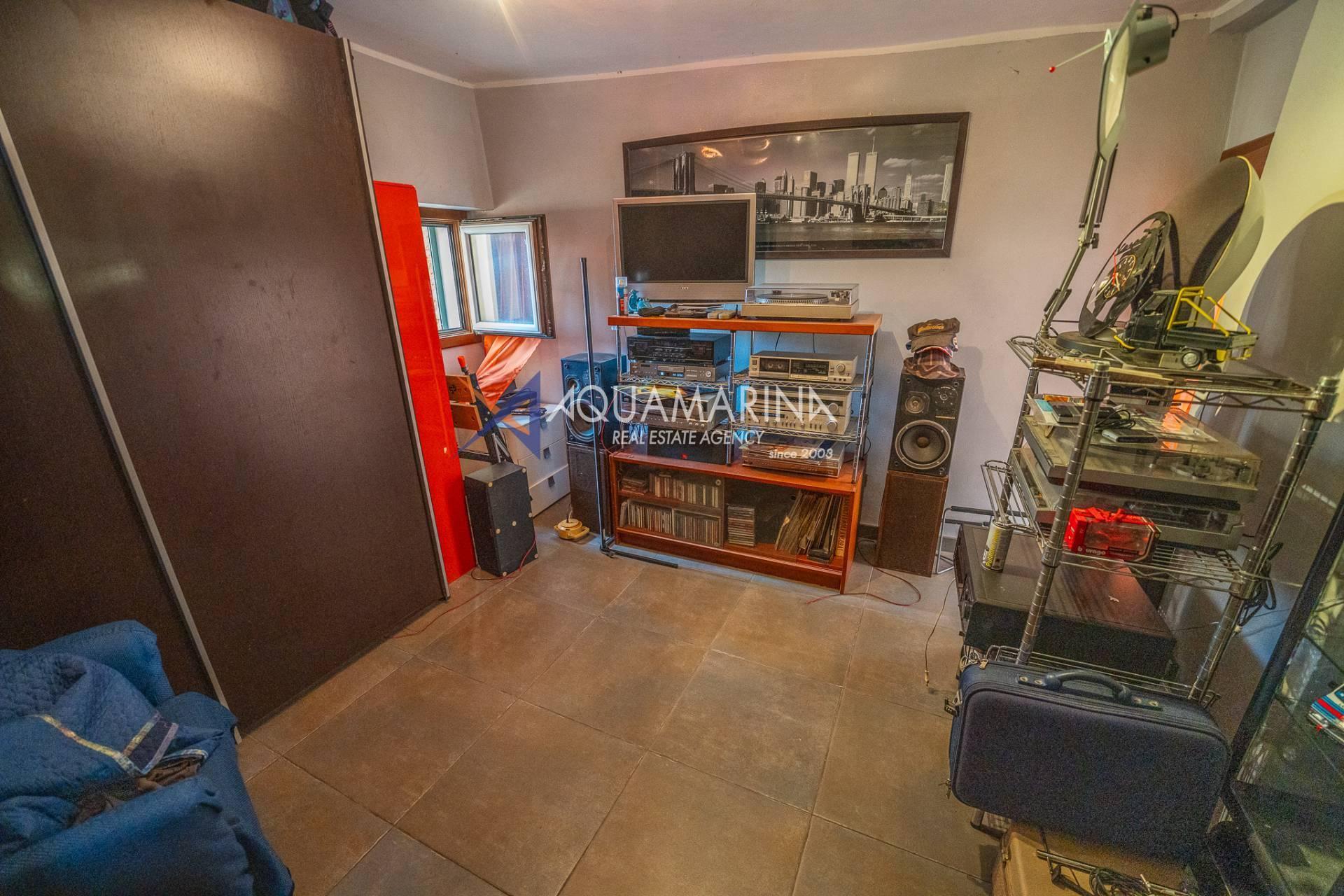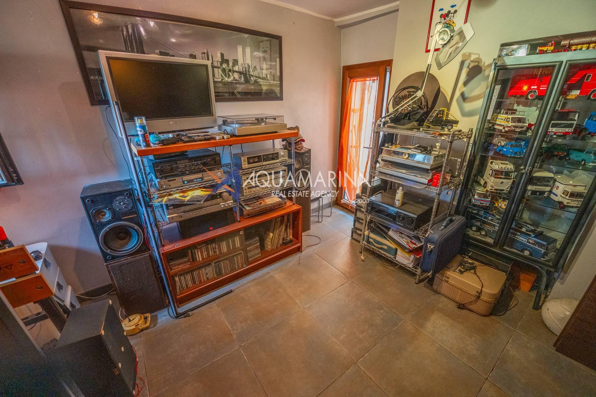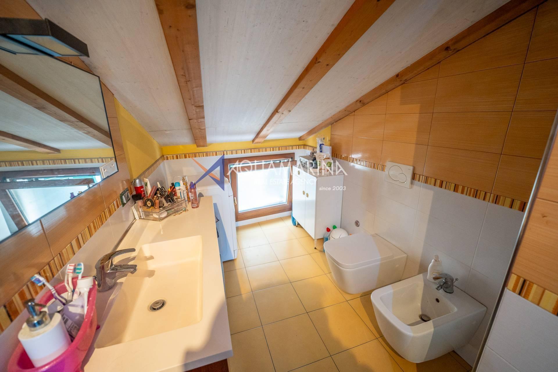 Im ersten Stock befinden sich der Schlafbereich mit zwei Doppelzimmern, ein Arbeitsbereich, der die Möglichkeit bietet, ein drittes Schlafzimmer einzurichten, und ein Badezimmer mit Badewanne und Fenster.