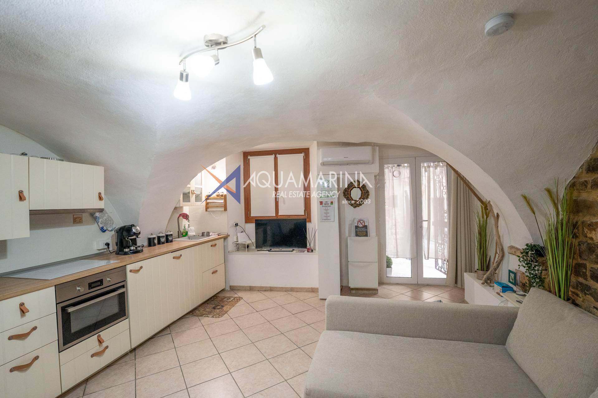 Dieses elegante Studio bewahrt die charakteristischen Merkmale der historischen ligurischen Architektur: eindrucksvolle Gewölbedecken, typische Ausblicke auf die „Carrugi" sowie dicke Steinmauern, die für ein natürliches Wohnklima sorgen und die Räume das ganze Jahr über angenehm kühl halten.