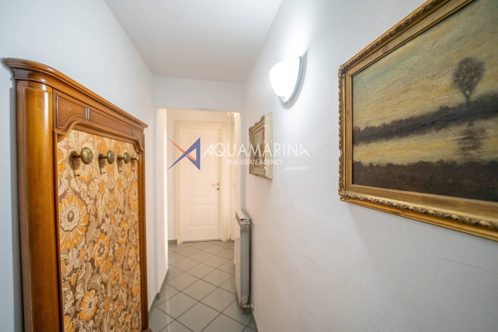 Eingang zu einem praktischen Flur, helles Wohnzimmer mit Kochnische und Balkon mit Blick auf die Via Roma, großes Doppelzimmer mit Panoramafenster und