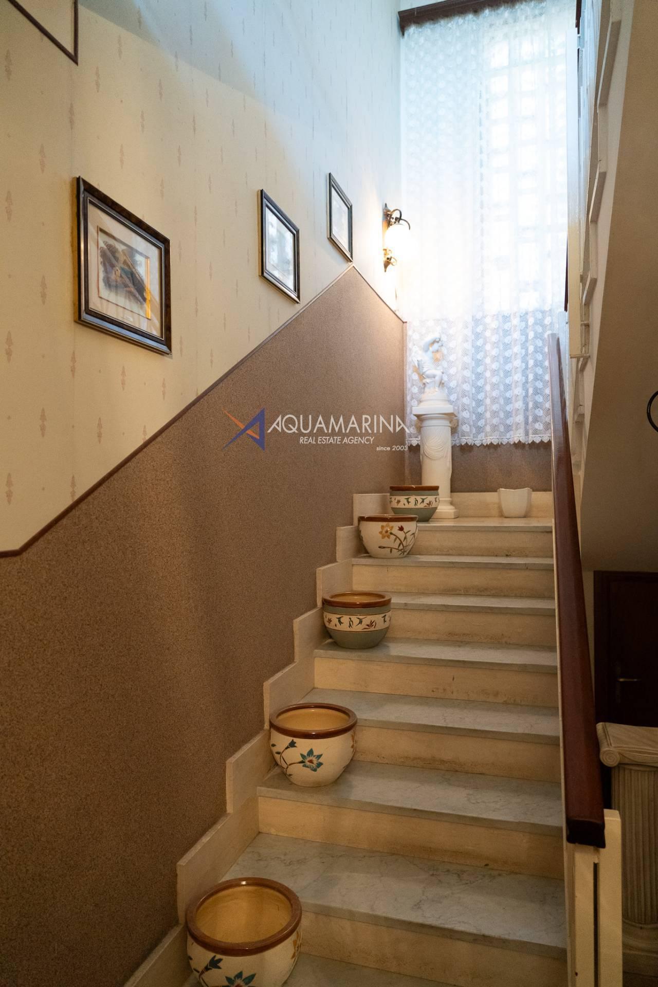 Im ersten Stock befinden sich ein zweites Wohnzimmer, eine geräumige Küche, zwei große Schlafzimmer, ein Badezimmer und eine helle Terrasse mit einem herrlichen Blick auf das Meer.