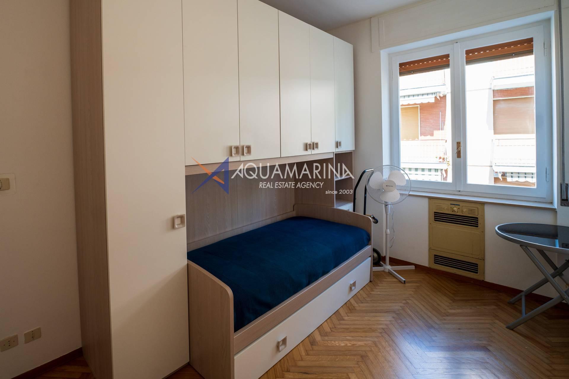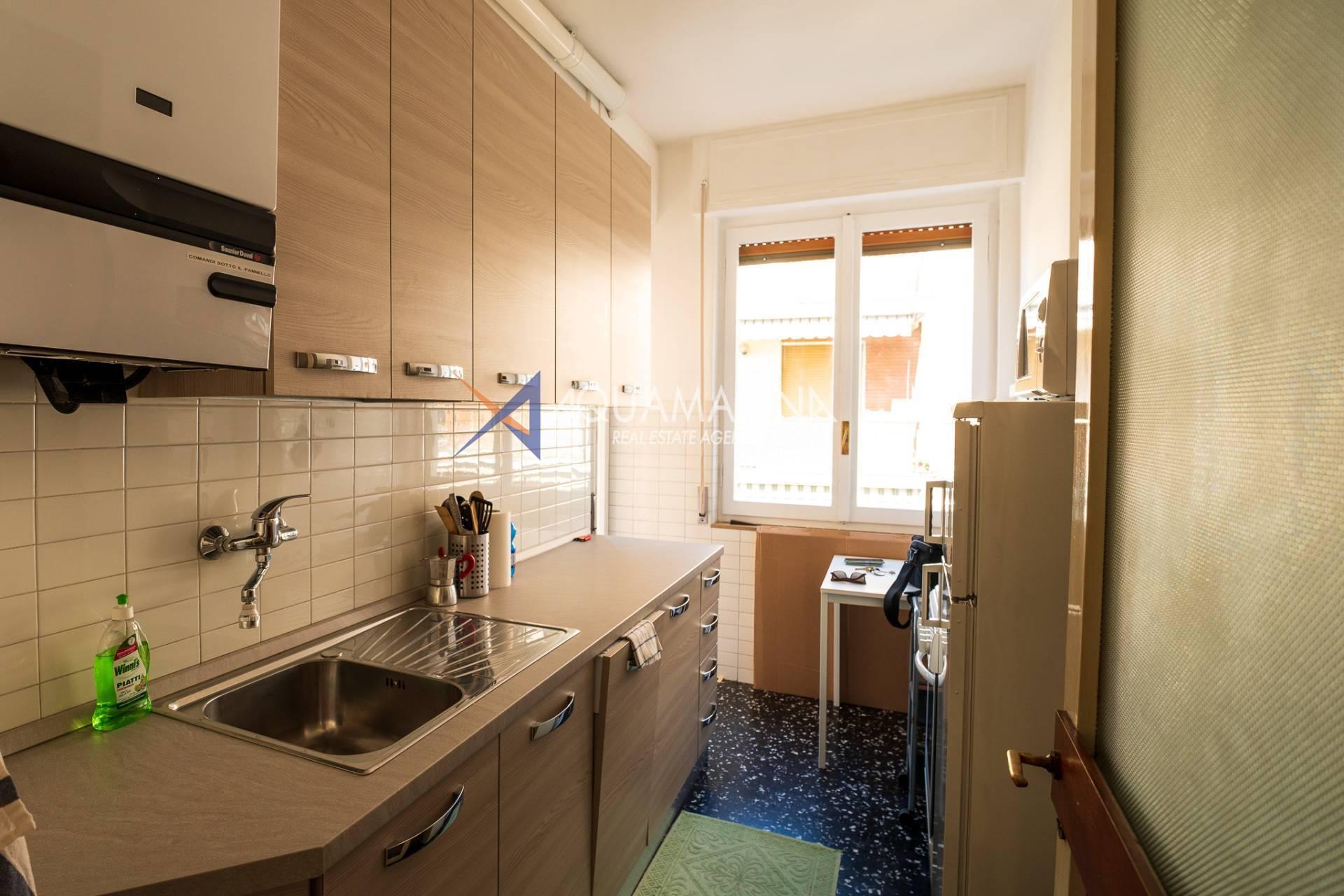 Sanremo, Foce-Bereich, in einem Wohngebiet und nur wenige Gehminuten von den Stränden entfernt, bieten wir eine prächtige Vierzimmerwohnung zum Verkauf an, bestehend aus Eingangshalle, Küche, drei sehr hellen Schlafzimmern, Badezimmer und zwei Terrassen mit bezauberndem Meerblick.