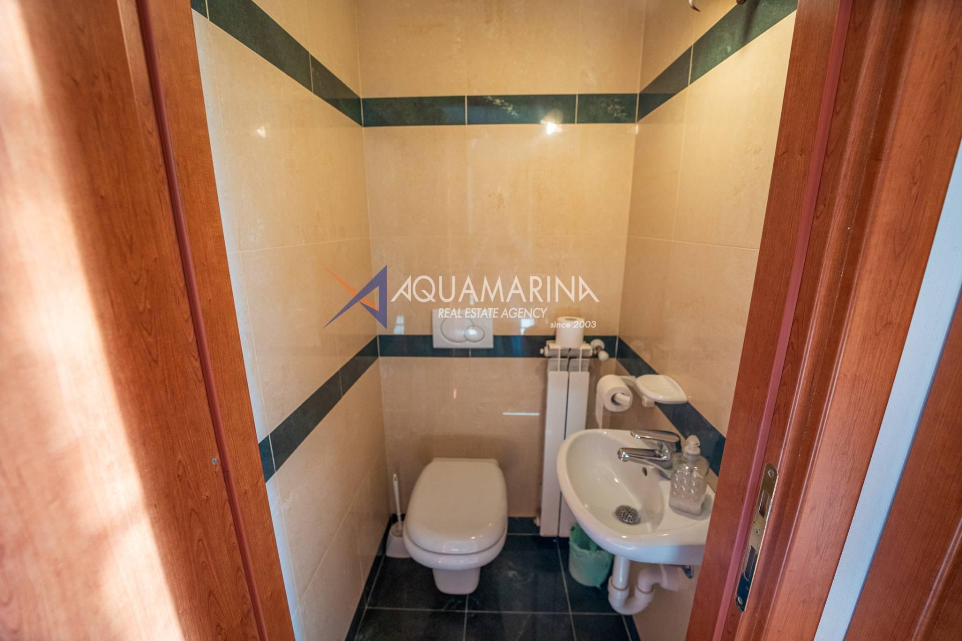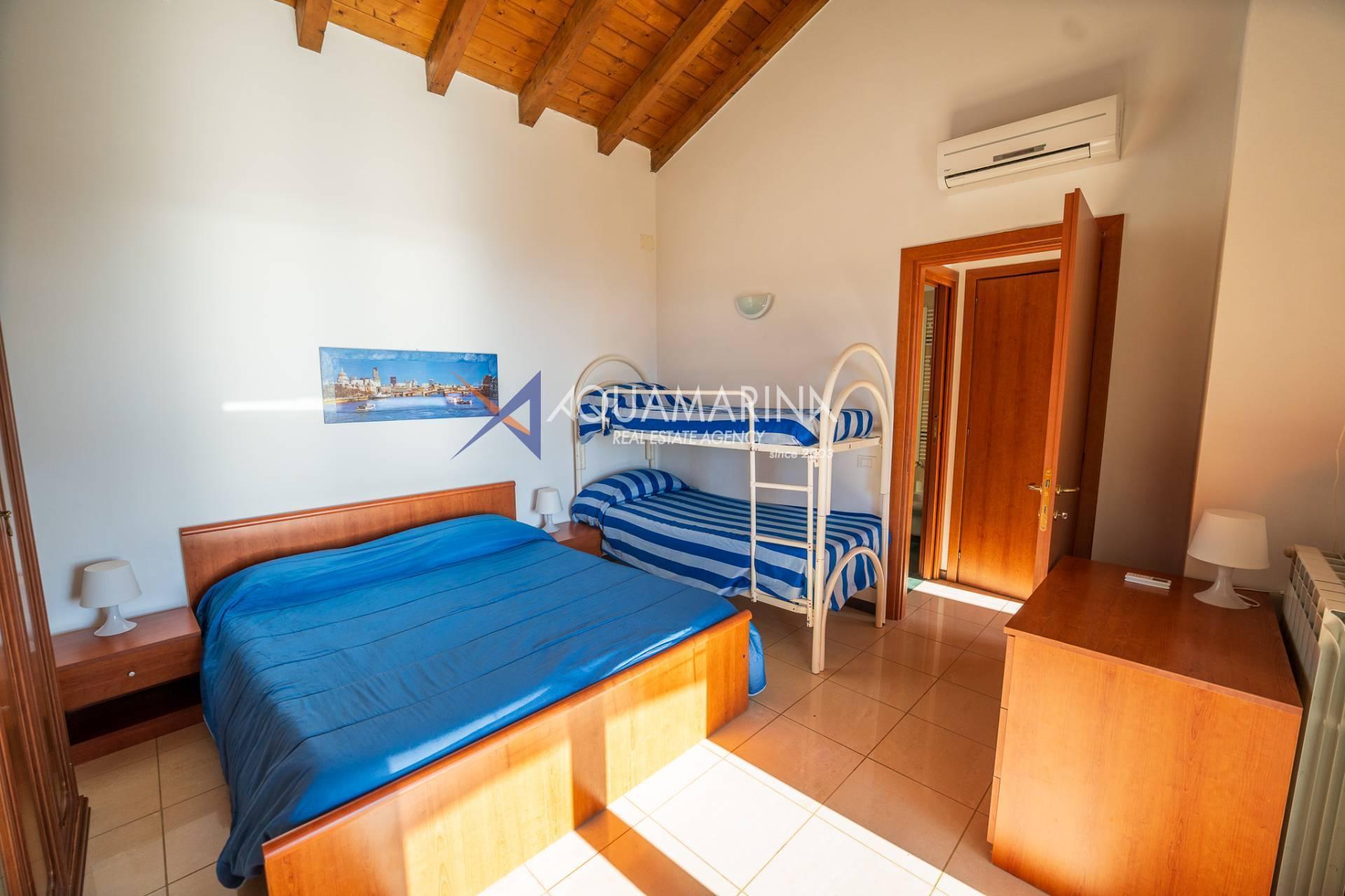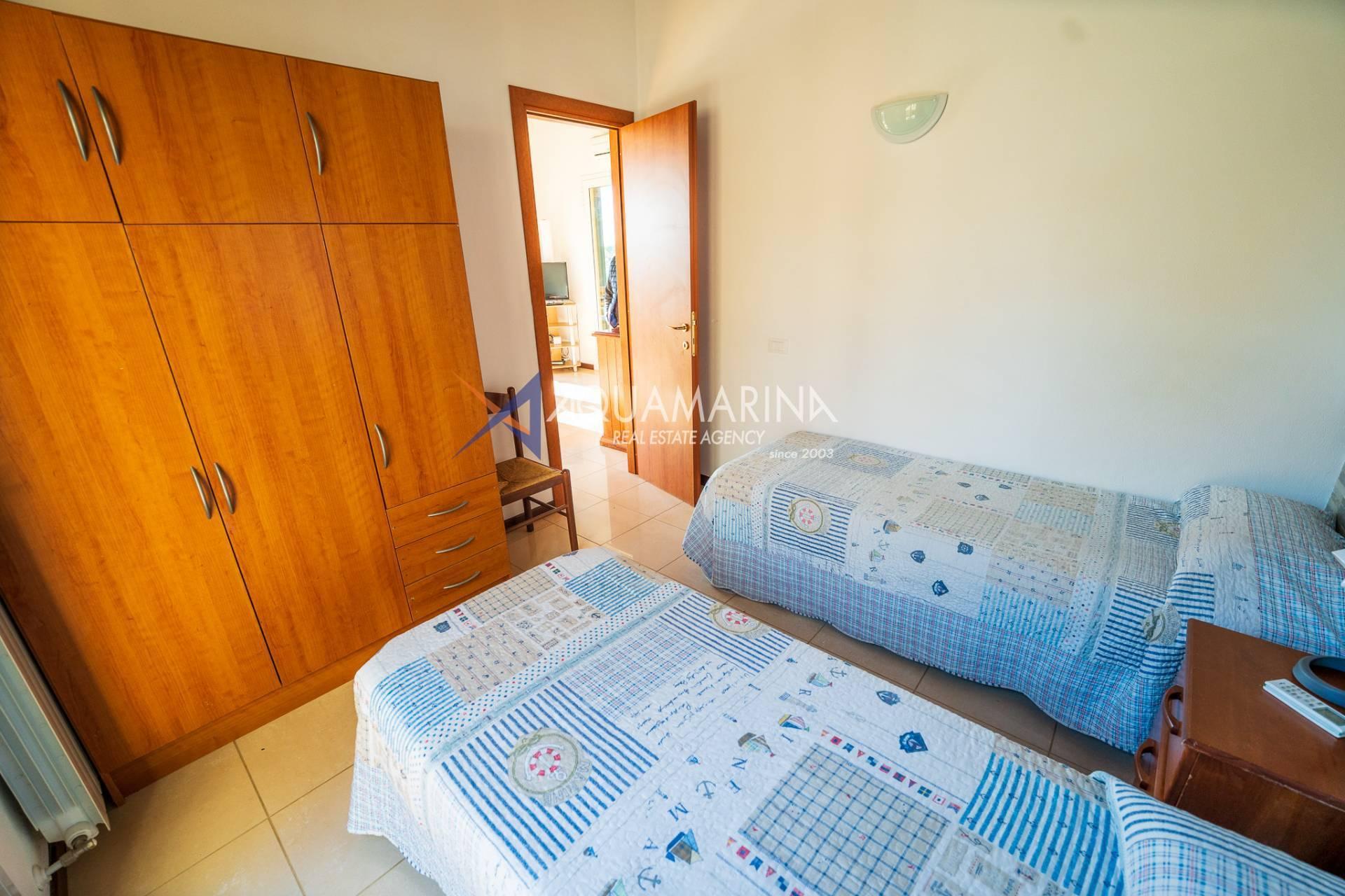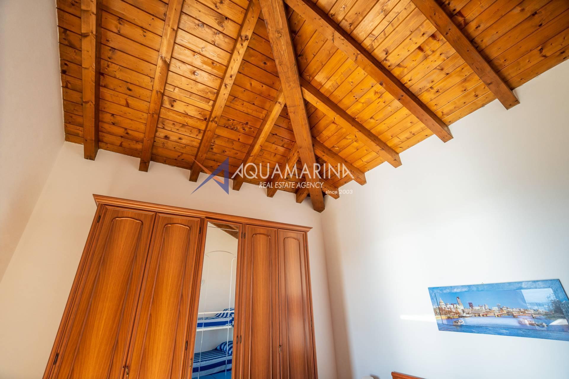 Im Obergeschoss befindet sich eine zweite Wohnung mit einem eleganten Wohnzimmer mit offener Küche, zwei großzügigen Schlafzimmern, einem Hauptbadezimmer und einem Gäste-WC. Von hier aus gelangt man auf die Veranda und die große Panoramaterrasse mit herrlichem Meerblick – ideal für Mahlzeiten im Freien und Momente der Entspannung.