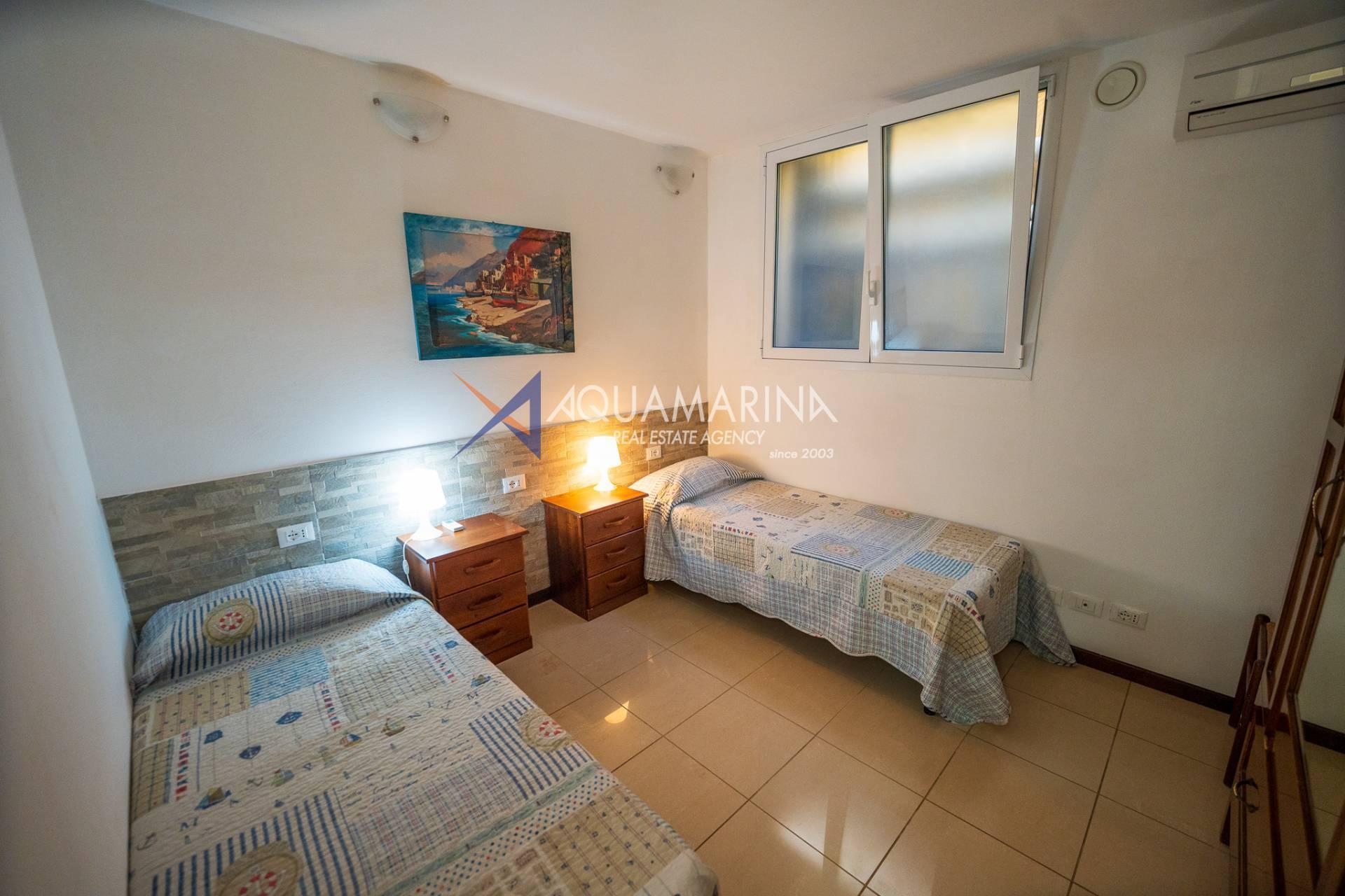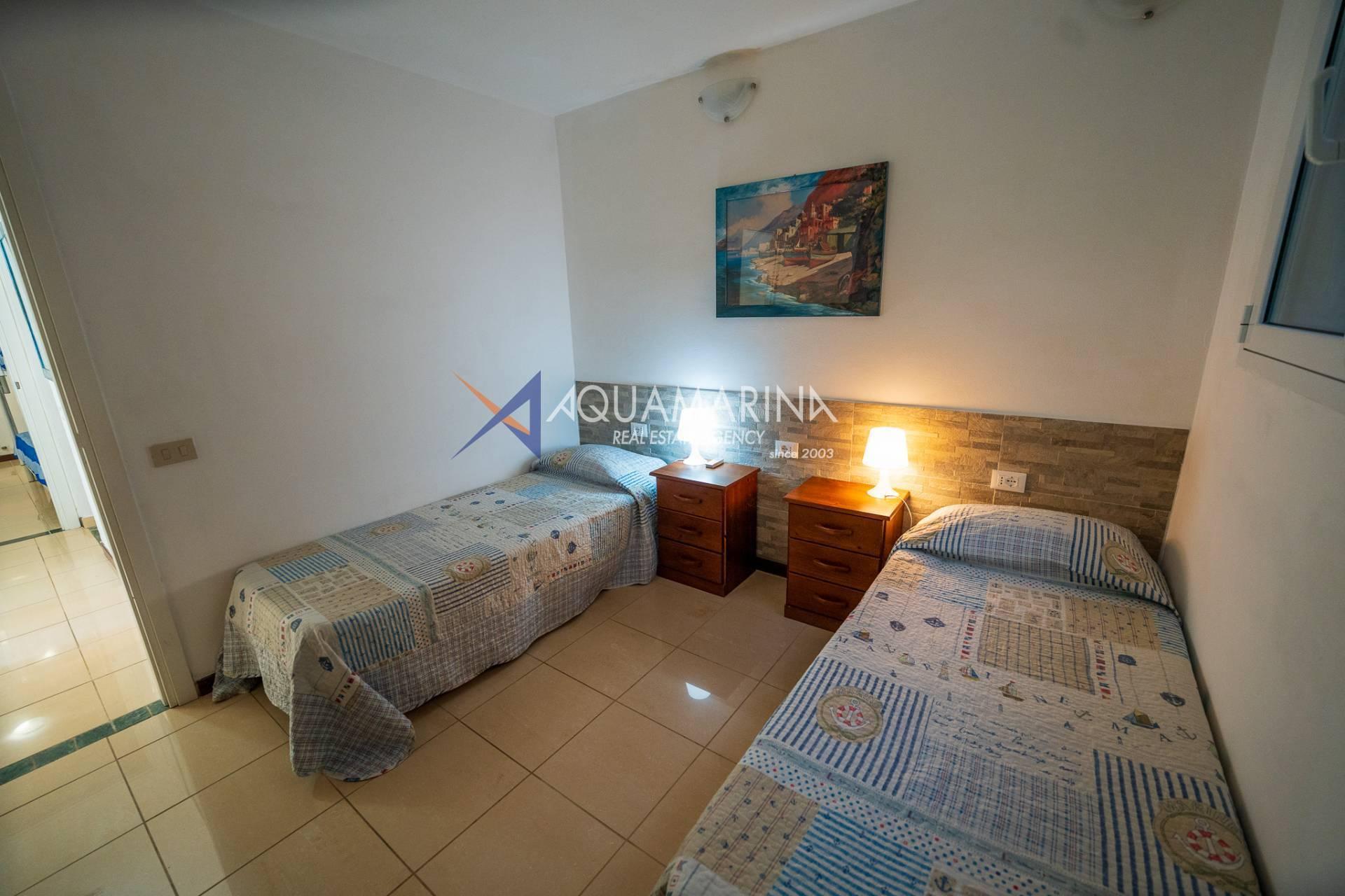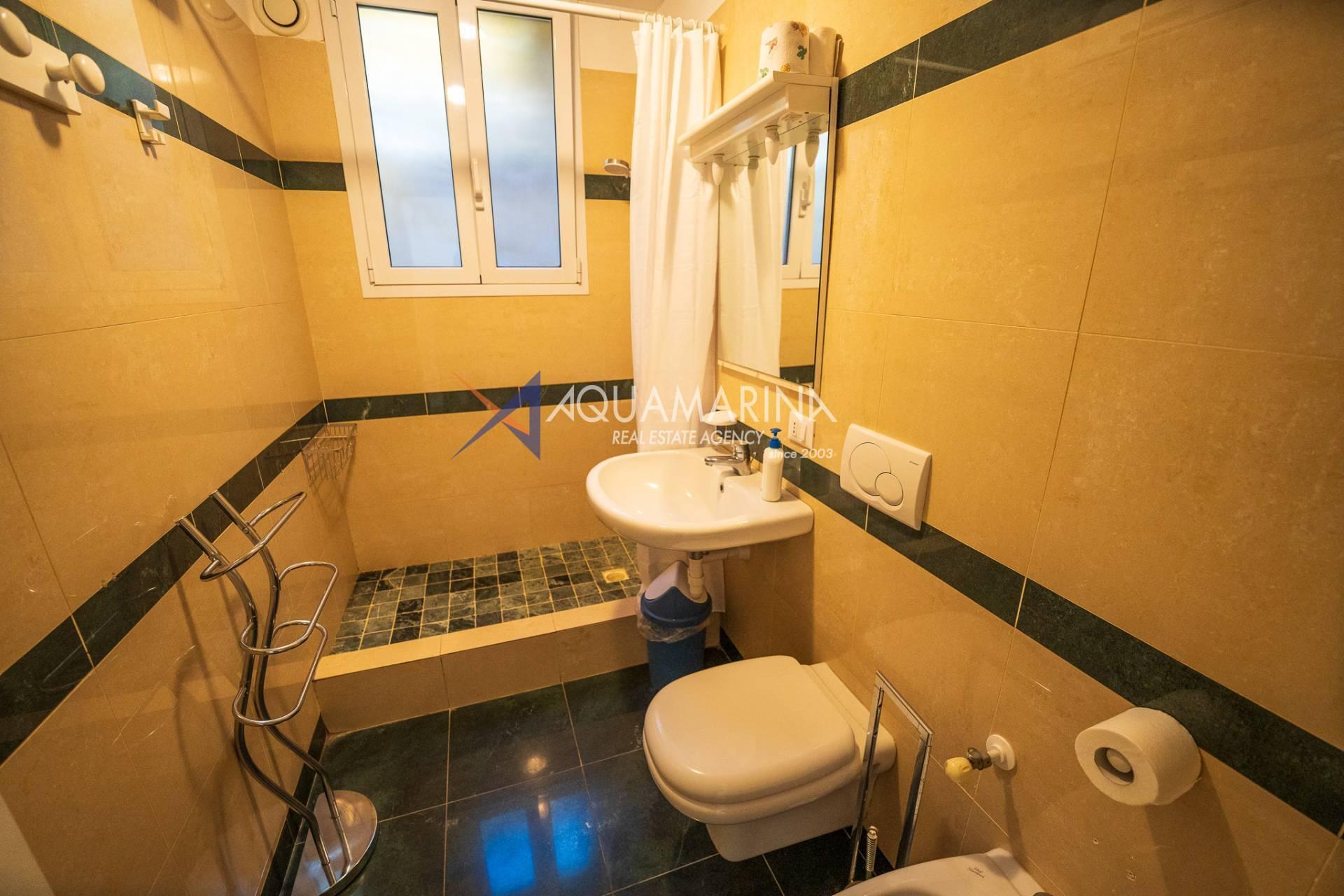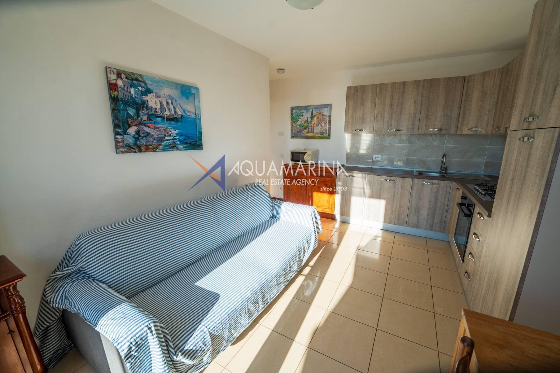 Im Obergeschoss befindet sich eine zweite Wohnung mit einem eleganten Wohnzimmer mit offener Küche, zwei großzügigen Schlafzimmern, einem Hauptbadezimmer und einem Gäste-WC. Von hier aus gelangt man auf die Veranda und die große Panoramaterrasse mit herrlichem Meerblick – ideal für Mahlzeiten im Freien und Momente der Entspannung.