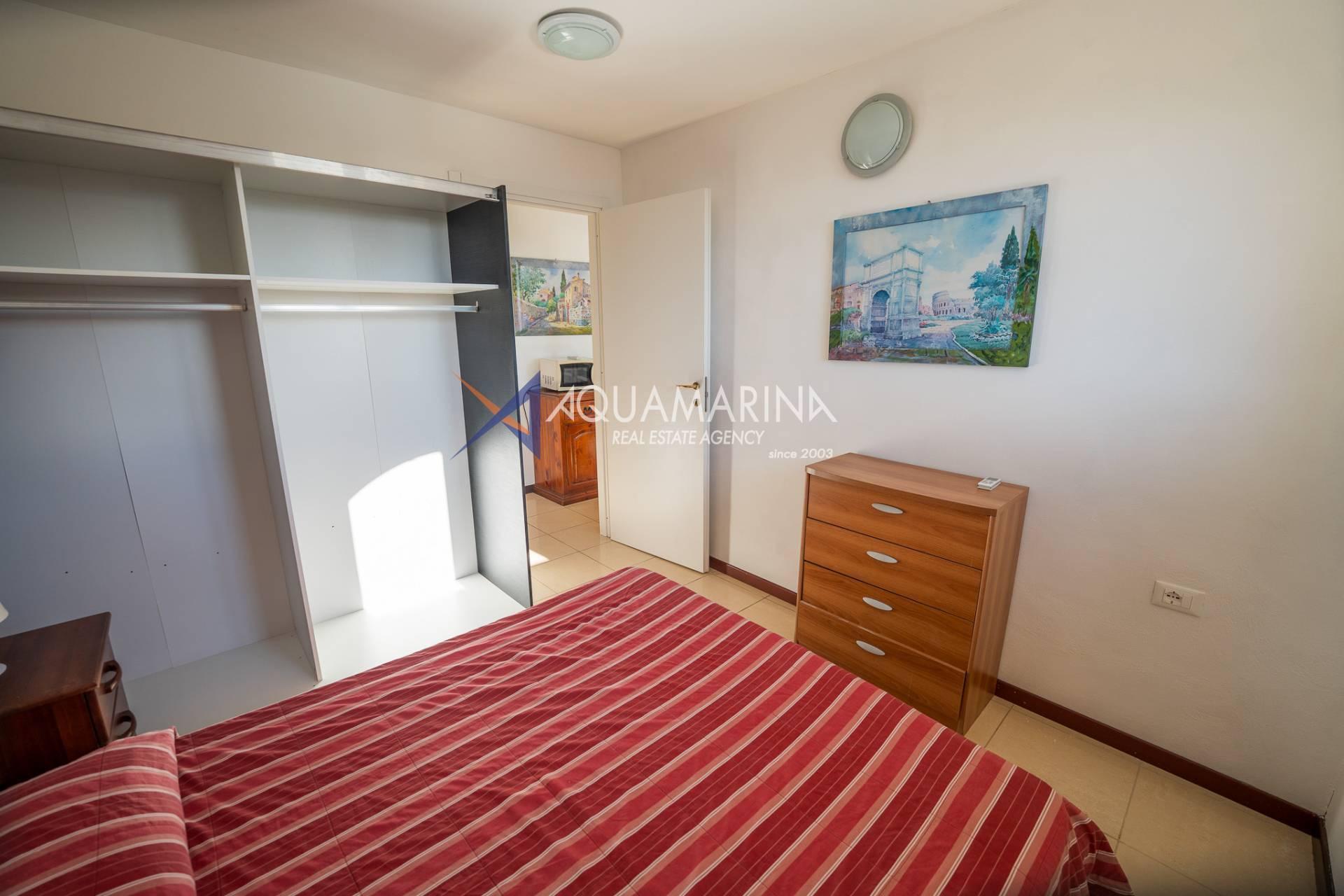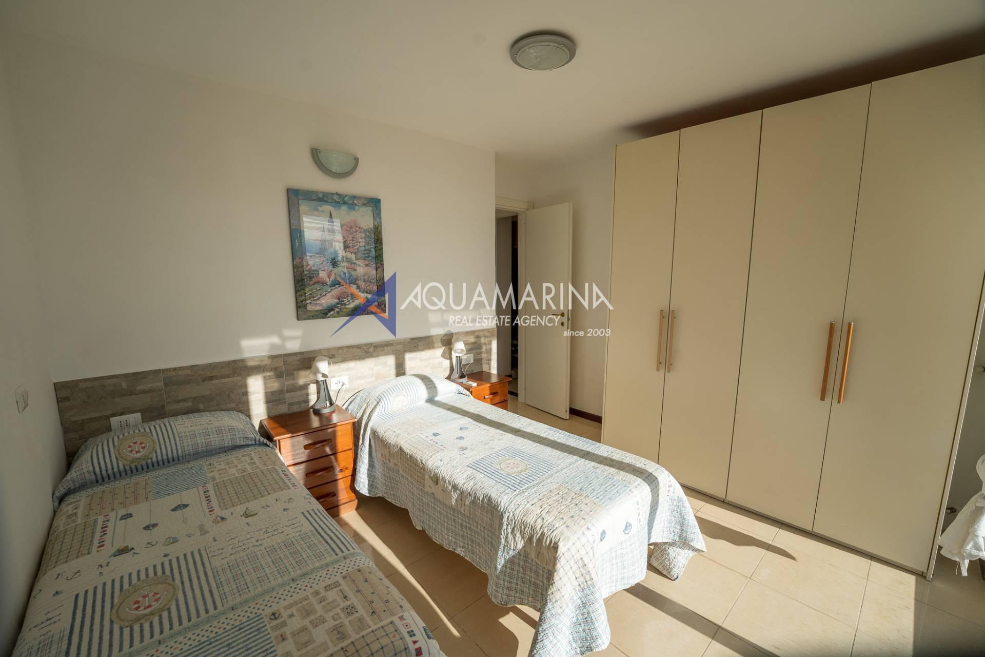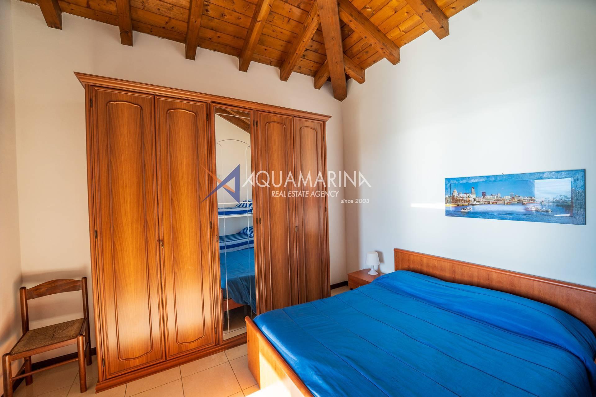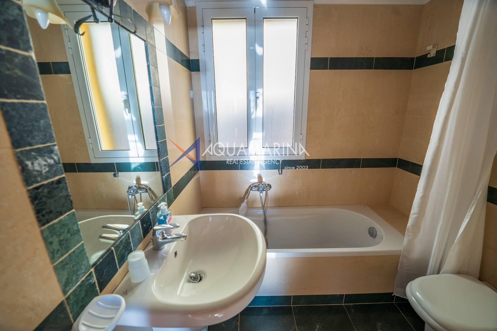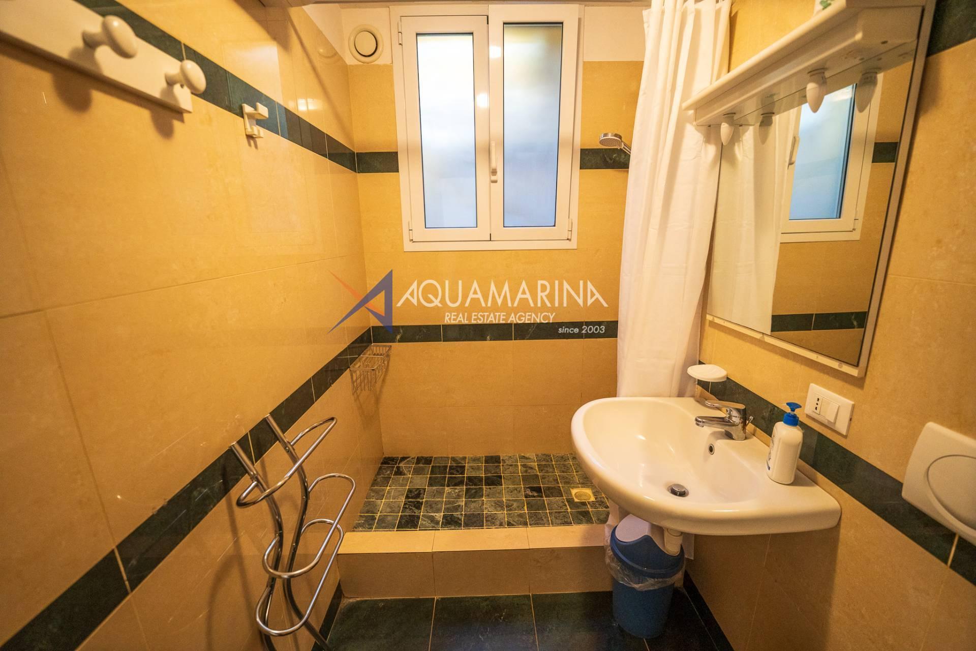 Im Obergeschoss befindet sich eine zweite Wohnung mit einem eleganten Wohnzimmer mit offener Küche, zwei großzügigen Schlafzimmern, einem Hauptbadezimmer und einem Gäste-WC. Von hier aus gelangt man auf die Veranda und die große Panoramaterrasse mit herrlichem Meerblick – ideal für Mahlzeiten im Freien und Momente der Entspannung.