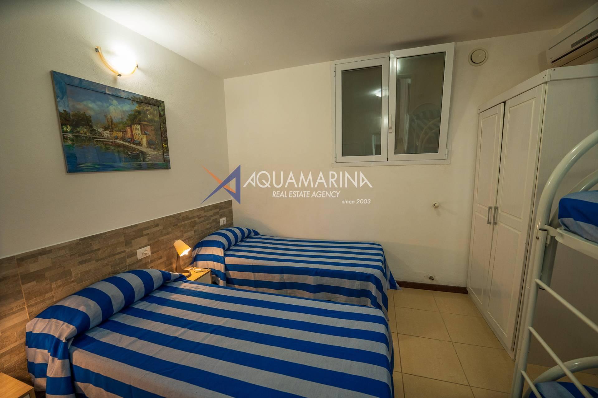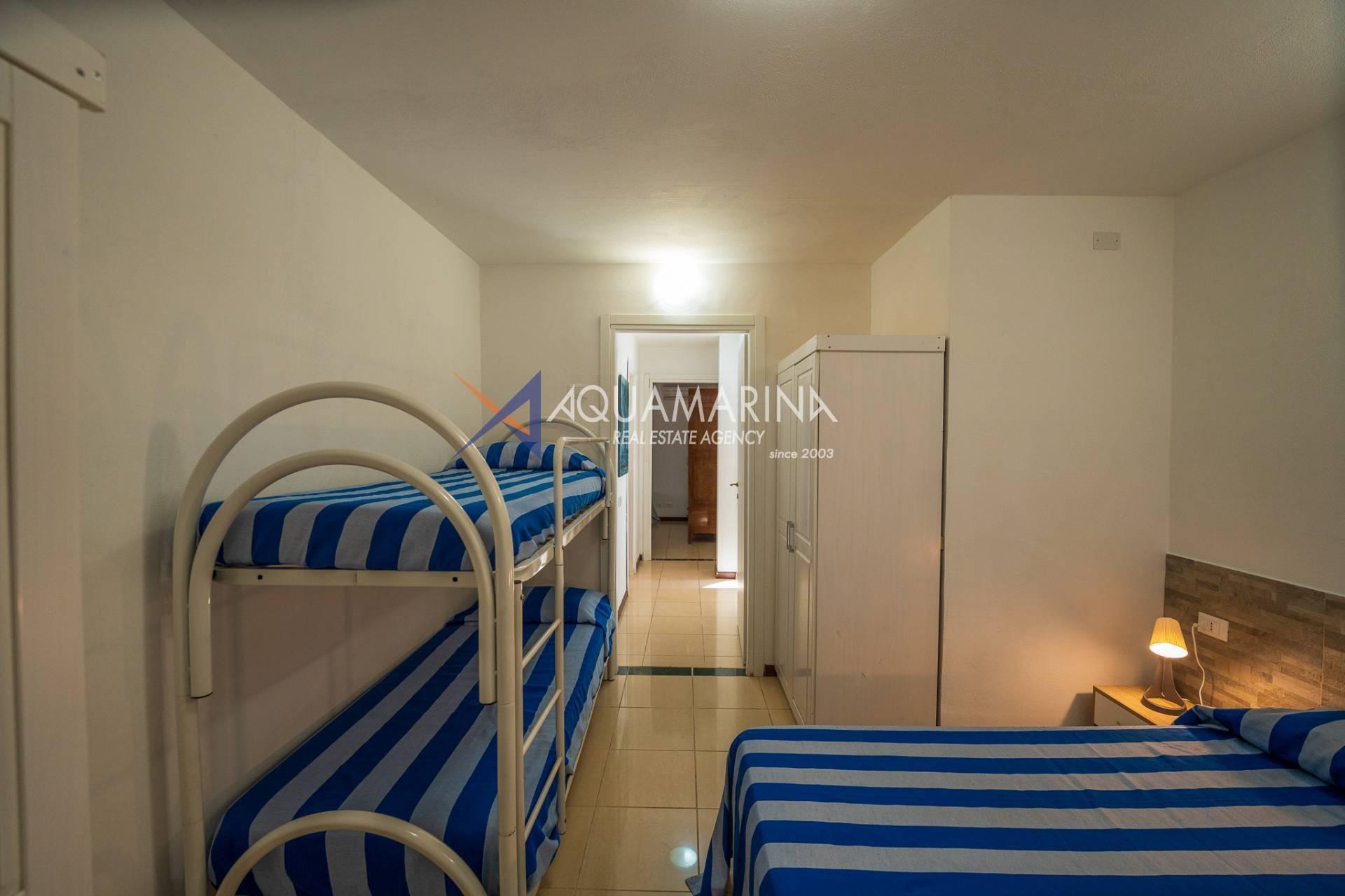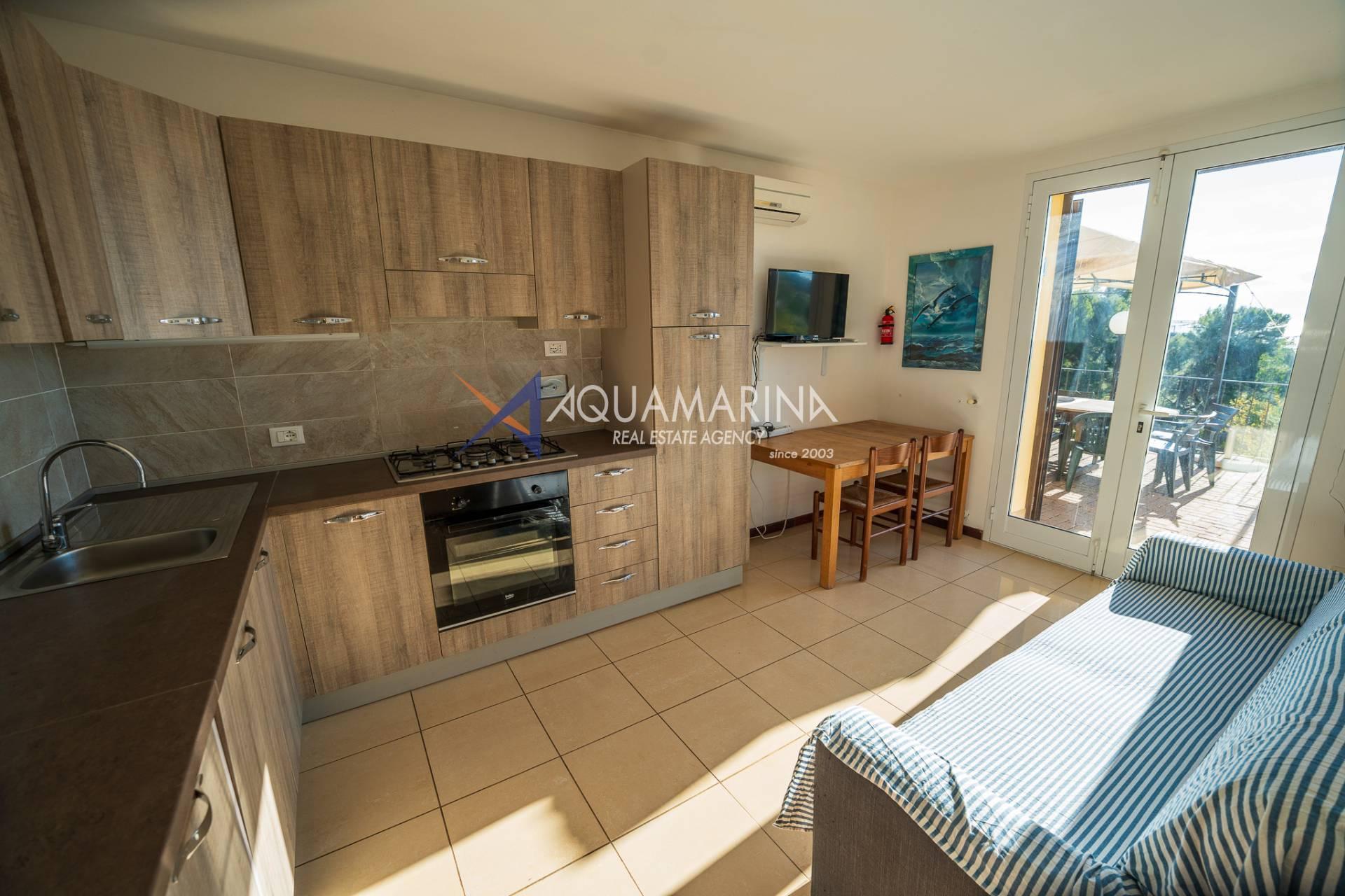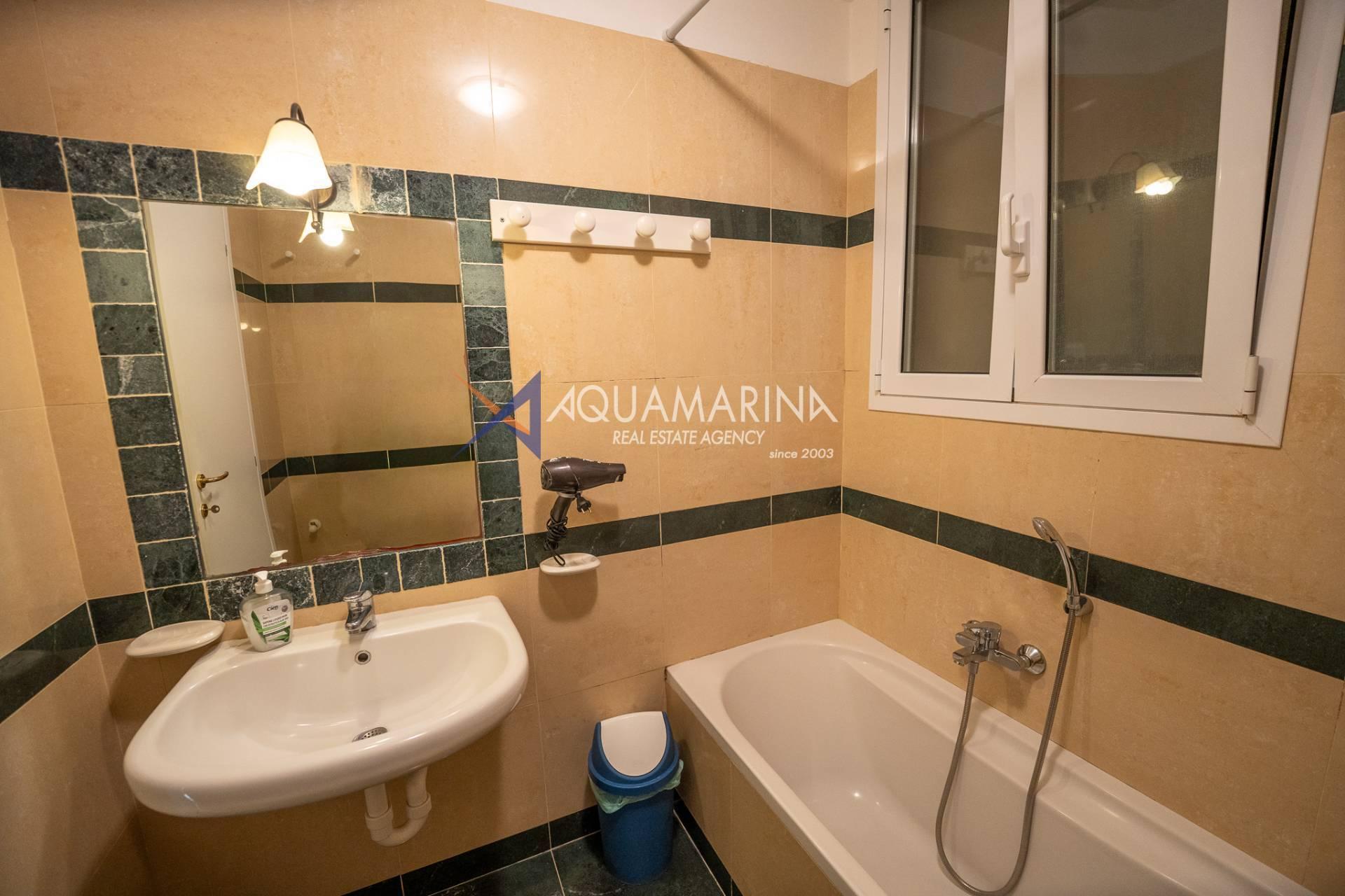 Im Obergeschoss befindet sich eine zweite Wohnung mit einem eleganten Wohnzimmer mit offener Küche, zwei großzügigen Schlafzimmern, einem Hauptbadezimmer und einem Gäste-WC. Von hier aus gelangt man auf die Veranda und die große Panoramaterrasse mit herrlichem Meerblick – ideal für Mahlzeiten im Freien und Momente der Entspannung.