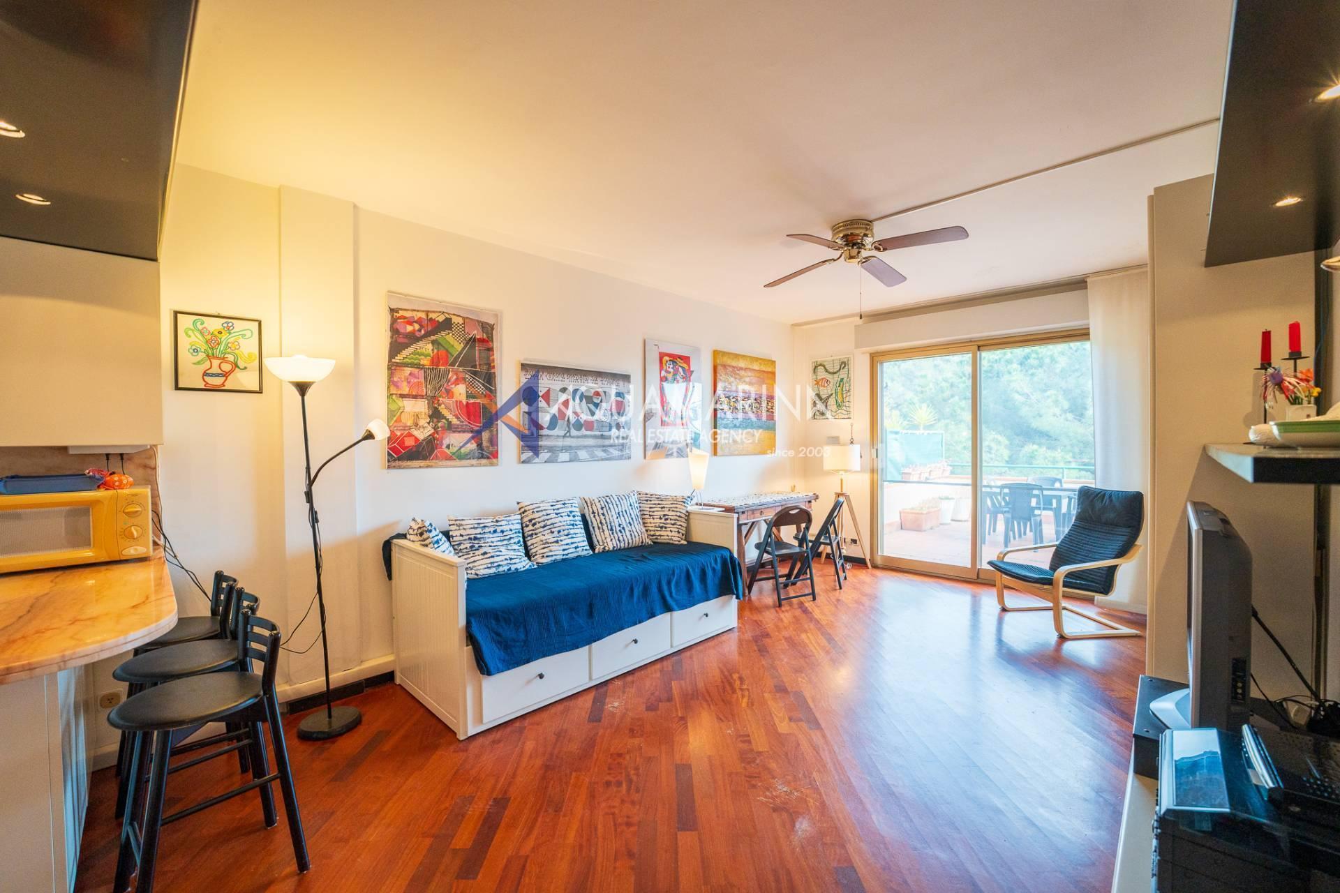 Das Apartment besteht aus einem einzigen Zimmer, das sowohl als Wohn- als auch als Schlafbereich dient, einem Badezimmer mit Badewanne und einer großen Terrasse mit Blick auf die Berge und das Meer, ideal, um entspannende Momente im Freien zu genießen.